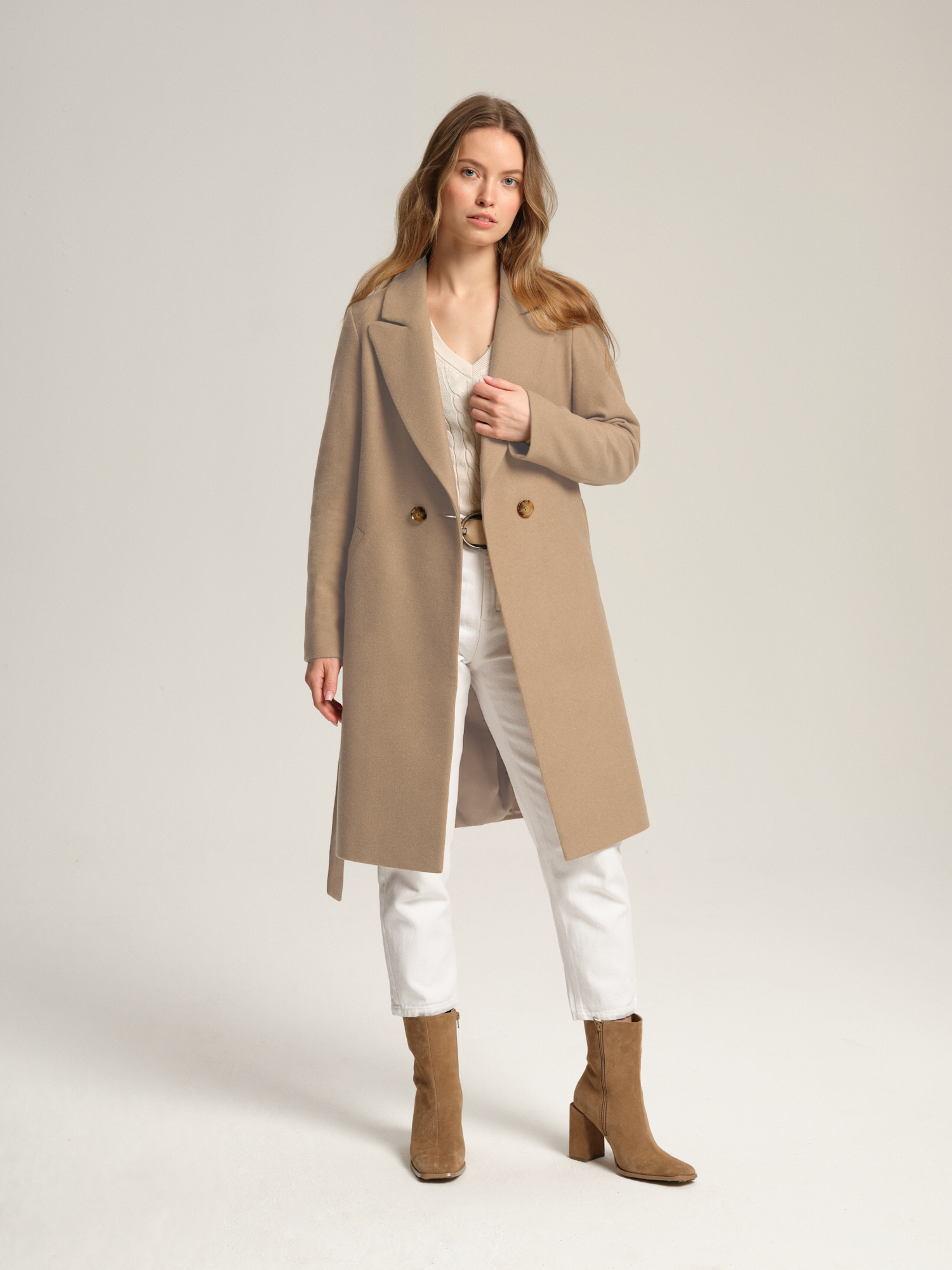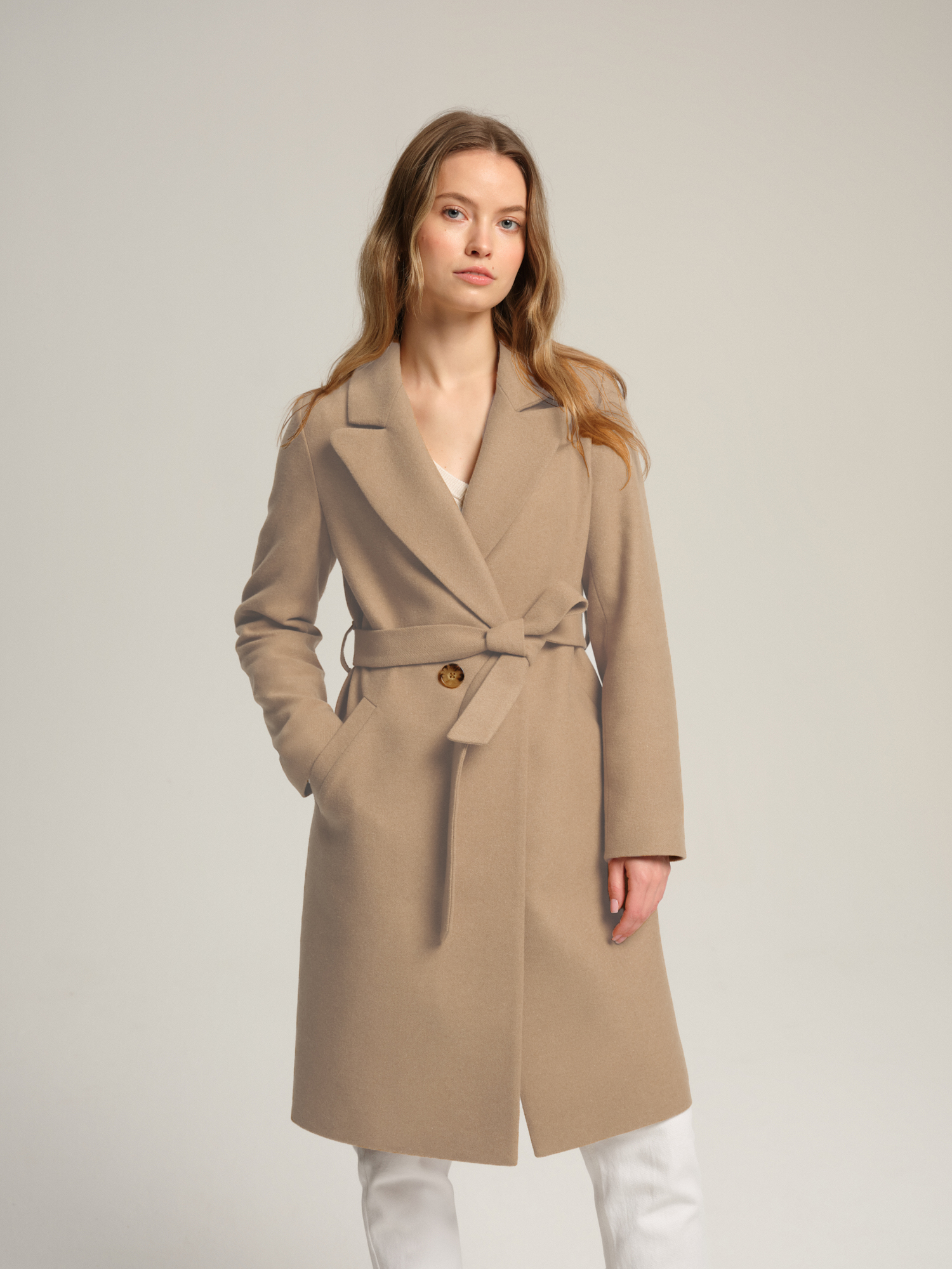 Beżowy płaszcz przejściowy z wełny i kaszmiru Ada to taliowany płaszcz o długości w kolano idealny na wiosnę i jesień. Uszyliśmy go z miękkiego materiału z bardzo dobrej jakości mieszanki wełnianej o lżejszej gramaturze. Całość wykończona acetatową podszewką. Wełniana tkanina oraz acetatowa podszewka zapewnią optymalny komfort termiczny niezależnie od zmieniającej się aury. Płaszcz jest zapiany na jeden guzik, drugi pełni fukcję ozdoby. Posiada pasek, który uszyliśmy z tej samej tkaniny. Dzięki nie mu można dodatkowo podkreślić talię. A wiązany z tyłu (podobnie jak w trenczu) optycznie wysmukli sylwetkę. Płaszcz ma dopasowany tył i profilowany przód, dzięki czemu płaszczyk jest bardzo wygodny i choć dopasowany, nie opina sylwetki. Dwie boczne kieszenie wykończone ozdobną listwą dodają praktyczności. Bez rozporka.