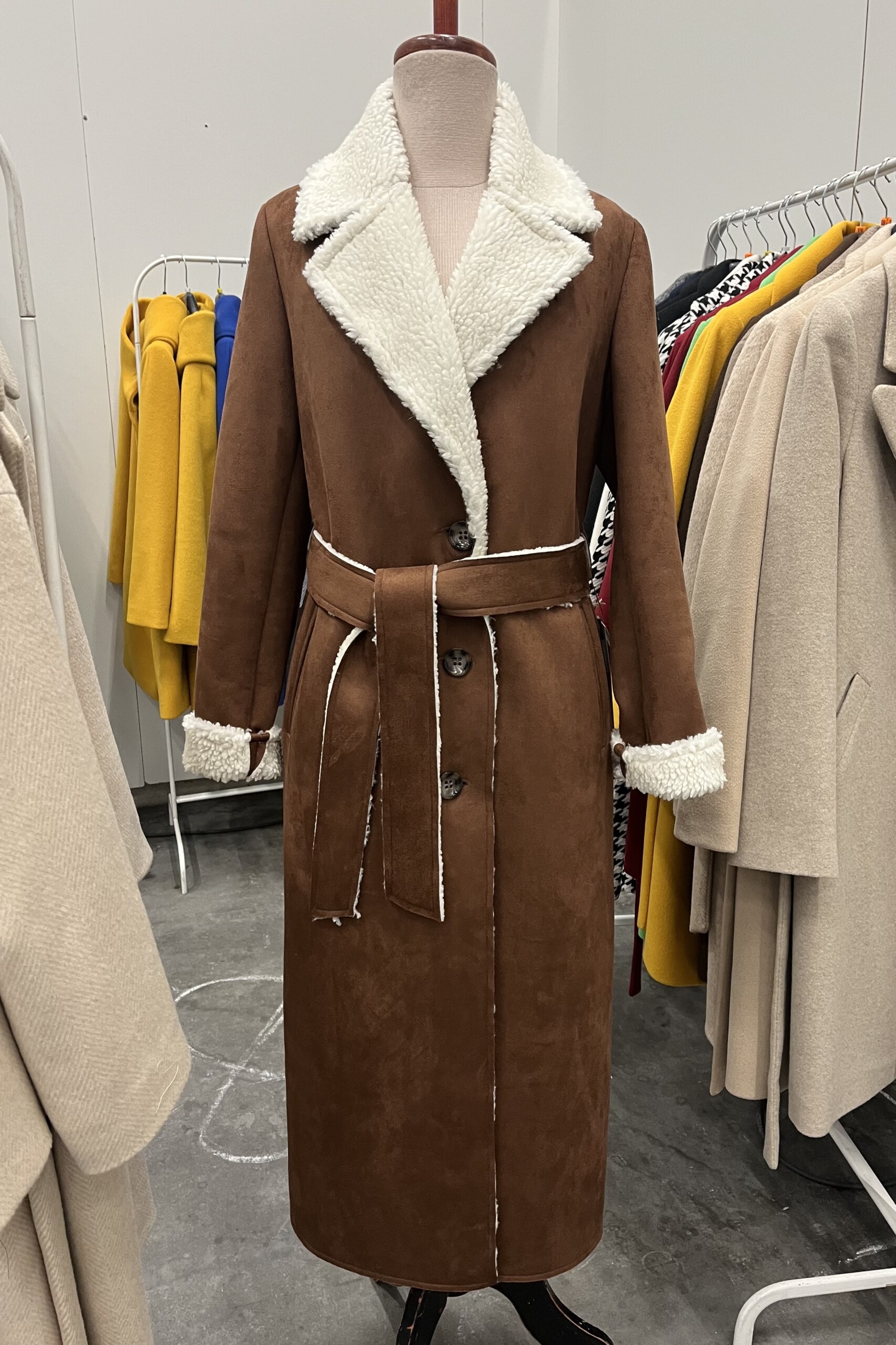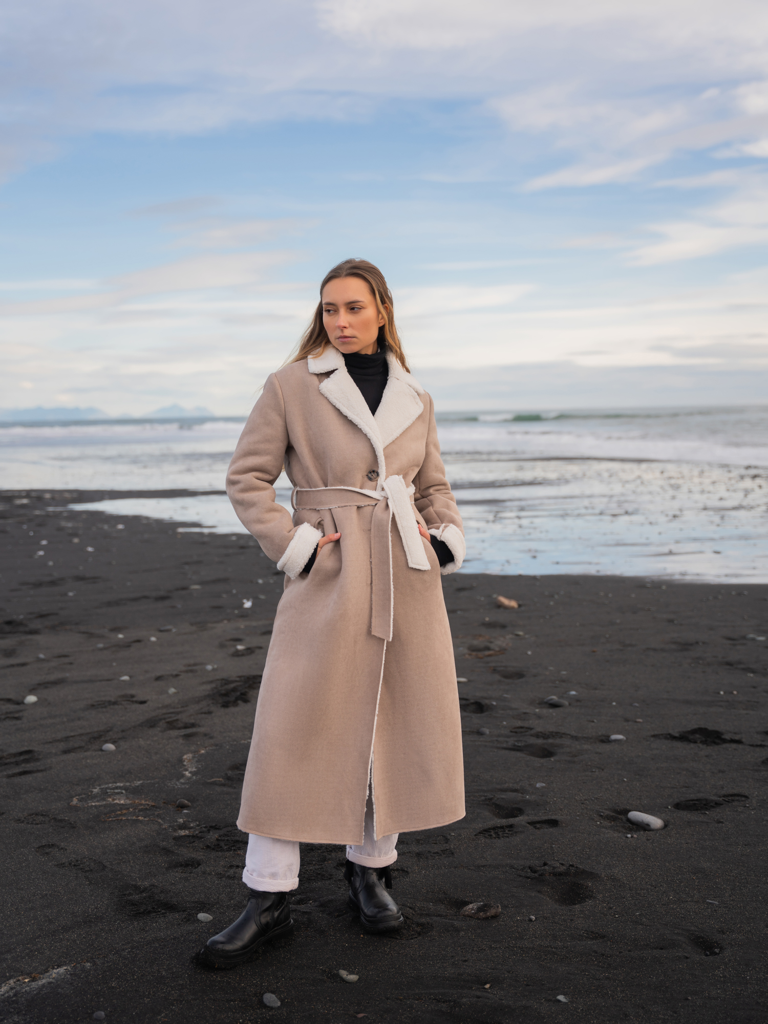 Brązowy długi zimowy kożuch New York to luźny jednorzędowy płaszcz z szerokimi klapami i dużym kołnierzem. Charakterystyczne dla kożuchów surowe wykończenie i widoczne futrzane wykończenie na kołnierzu i mankietach (dzięki czemu można dowolnie regulować długość rękawa). Zapinany na guziki, z paskiem w talii do wiązania. Dwie boczne kieszenie dodające funkcjonalności. Kożuch ma klasycznie wszywany rękaw, taliowany tył z rozporkiem i profilowany przód. Nie jest to fason obszerny, ale swobodny i bardzo wygodny. Idealny do tworzenia wielowarstwowych miejskich stylizacji.
