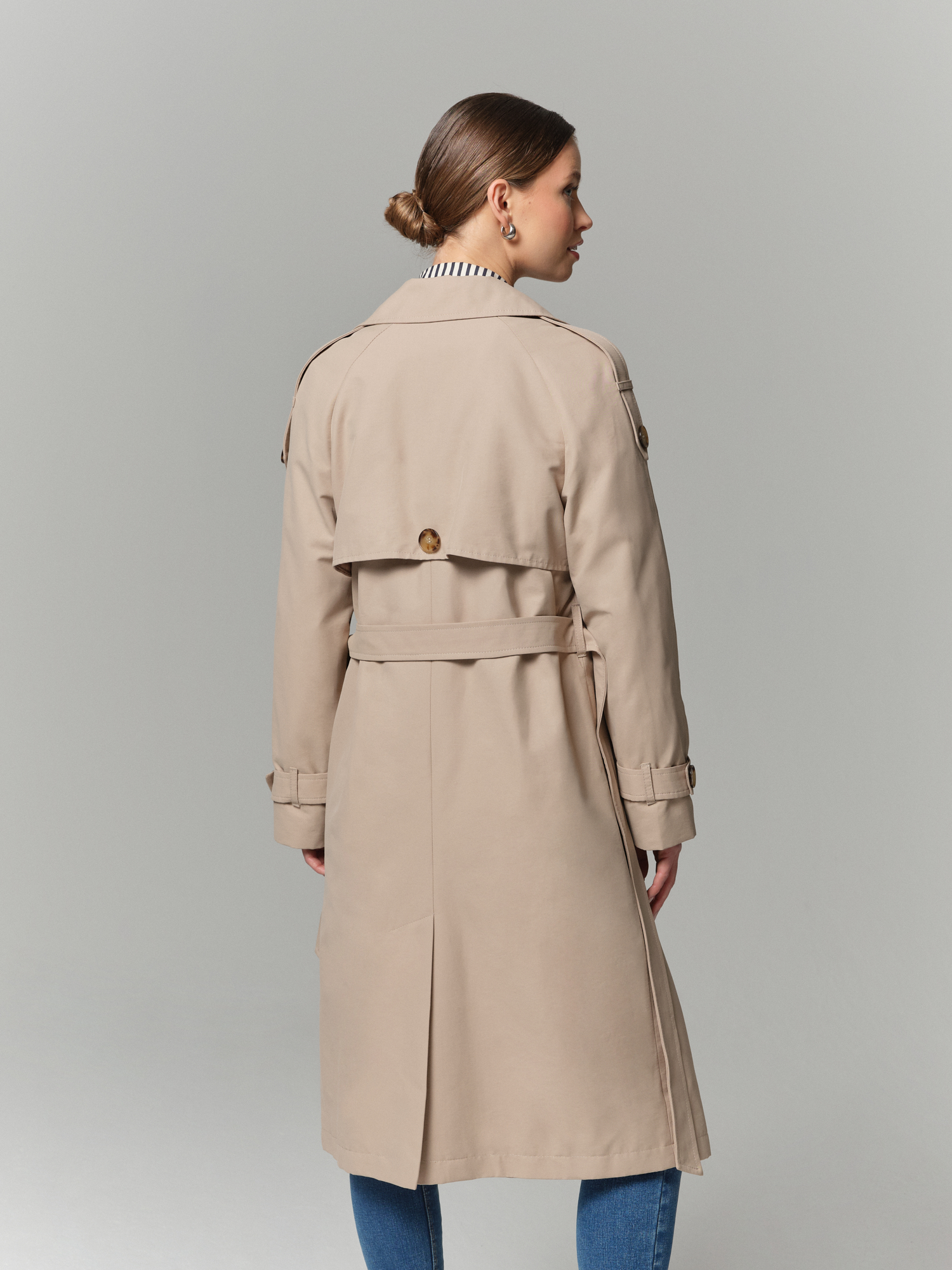 Trencz damski bawełniany midi w chłodnym beżu Marcela ma starannie dopracowany fason, który podkreśla sylwetkę, a jednocześnie zapewnia komfort i przestronność, umożliwiając noszenie swetra lub marynarki. Raglanowa konstrukcja rękawów zapewnia swobodę ruchów, a dodatkowe zaszewki modelują i akcentują figurę. Można też wiązać go paskiem, dla lepszego dopasowania. Trencz świetnie prezentuje się zarówno w za dużym rozmiarze, jak i w wersji dopasowanej. Wypada luźniejszy ale nie oversizowy. Jeśli zastanawiasz się jaki wybrać płaszcz, proponujemy zapoznać się z naszymi wskazówkami Wie wählt man einen Mantel, der zur eigenen Figur passt?