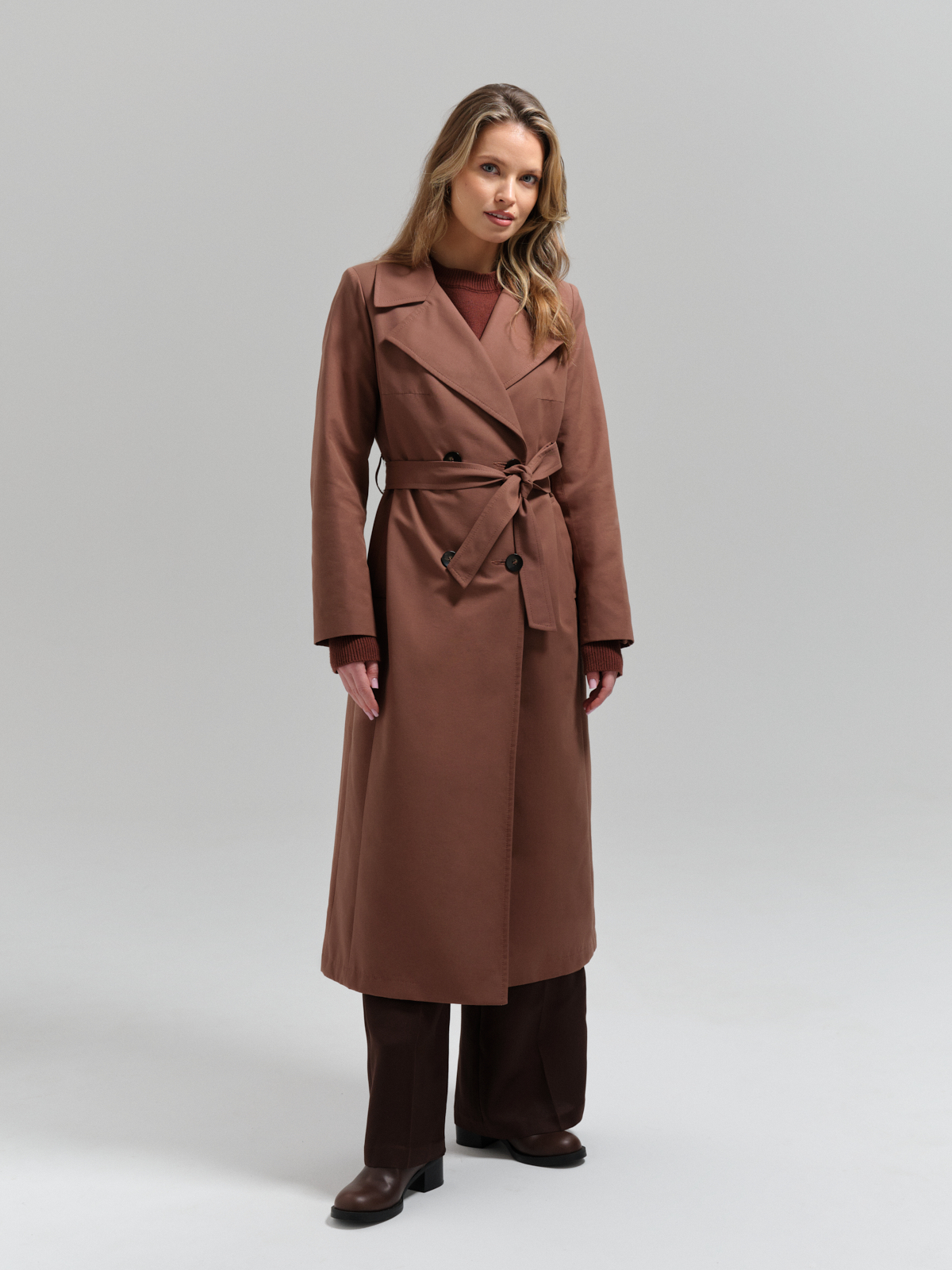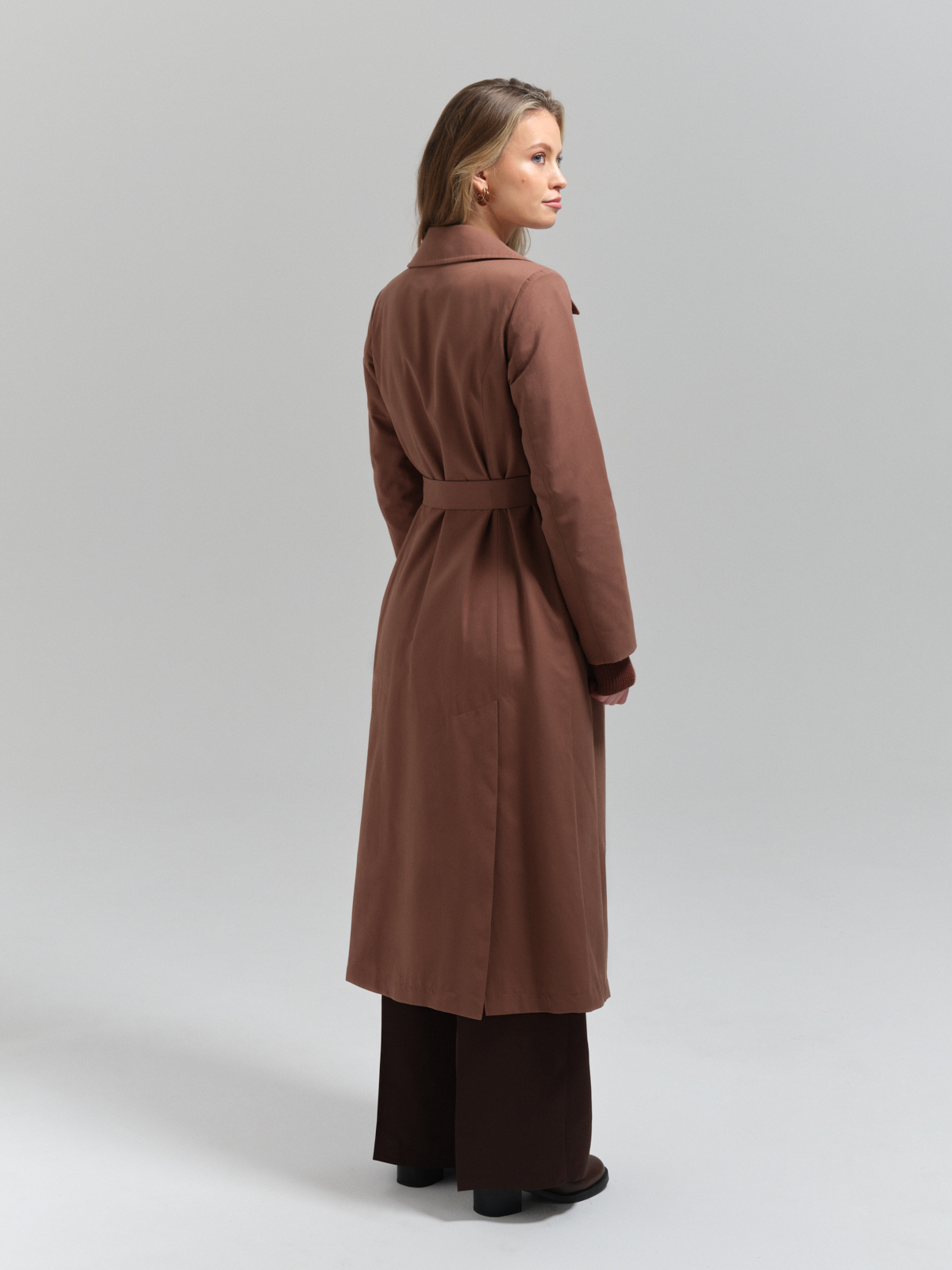 Długi czekoladowy trencz damski z bawełny Nela to szykowny, elegancki trencz o długości maxi. Starannie dopasowany z tyłu, przód profilowany, dzięki czemu płaszcz podkreśla sylwetkę, nie opinając jej. Tkaninowy pasek, wykonany z tej samej bawełnianej mieszanki co płaszcz, umożliwia delikatne zaznaczenie talii. Z boku dwie wpuszczane kieszenie – praktyczne i spójne z minimalistycznym fasonem płaszcza. Wykładany reverse flange – podniesiony – idelanie otula i chroni przed wiatrem. Dzięki temu trencz jest i funkcjonalny i modny. Dwa rozporki na tyle – subtelnie zdobią, optycznie wysmuklają i zapewniają wygodę. Długość płaszcza do połowy łydki. Zapinany double-breasted with buttons. Model w całości na podszewce. Idealny wybór na przejściowe pory roku.