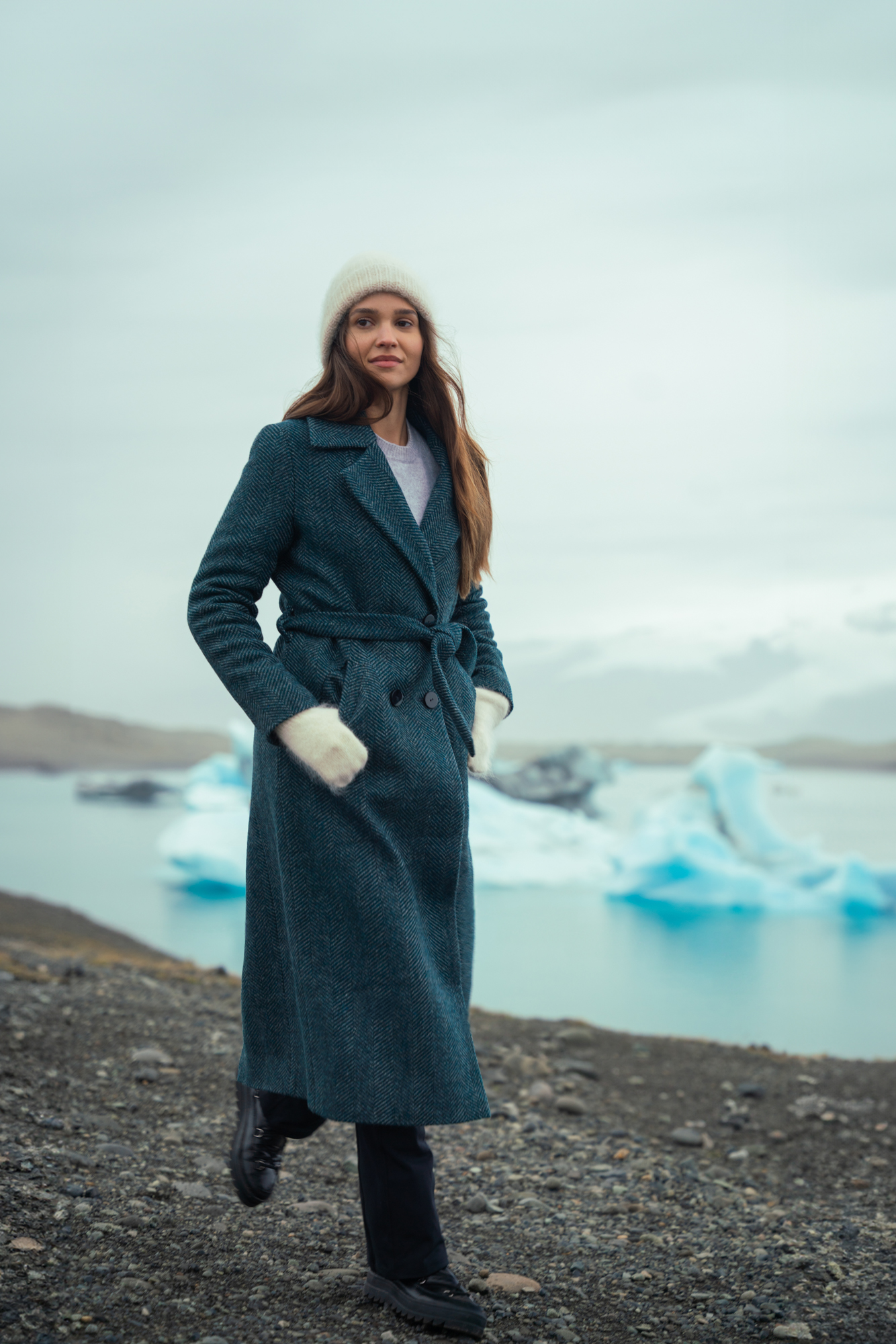 Długi płaszcz damski w jodełkę 100% wełna dziewicza Lukka to ocieplany płaszcz zimowy o klasycznym, ponadczasowym kroju i wzorze w jodełkę. Z tyłu dopasowany do sylwetki, przód profilowany, dzięki czemu płaszczyk jest bardzo wygodny i choć dopasowany, nie opina sylwetki. W talii przewiązywany paskiem z tej samej tkaniny, co pozwala dodatkowo podkreślić kobiecą figurę. Ozdobny kołnierz typu rewers można postawić, by skutecznie chronił przed wiatrem, tworząc jednocześnie efektowny akcent stylizacji.