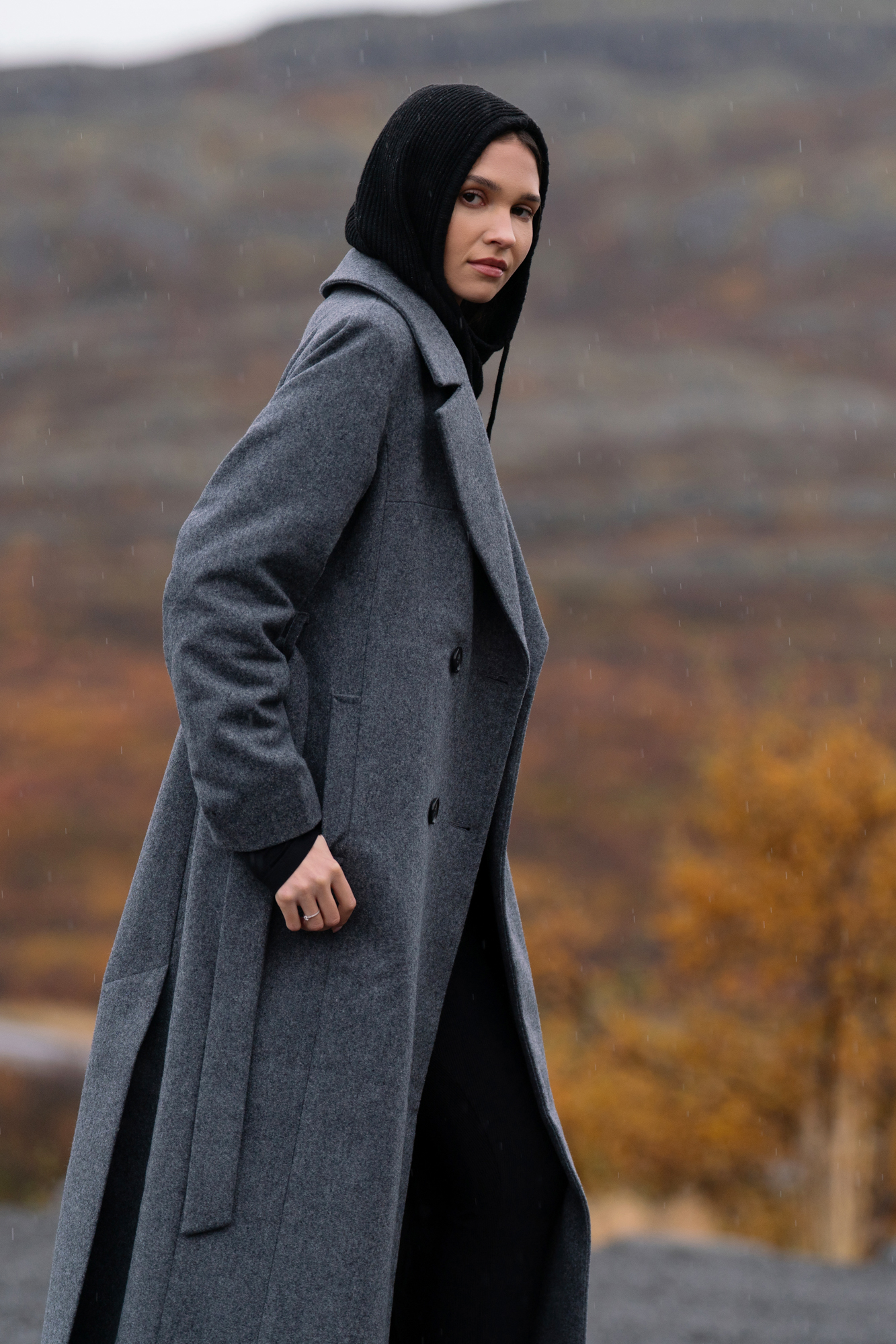 Long coat in wool and cashmere graphite melange Sky powstał w naszym rodzinnym zakładzie krawieckim w Poznaniu. Uszyliśmy go z wysokiej jakości materiału pochodzącego z tzw. deadstocku – nadwyżek produkcyjnych renomowanej marki. Choć pozyskiwanie takich tkanin wymaga czasu i zaangażowania, pozwala nam oferować materiały klasy premium w korzystnej cenie, jednocześnie ograniczając skalę globalnej nadprodukcji. Wierzymy, że moda może i powinna iść w parze ze zrównoważonym podejściem, dlatego starannie wybieramy każdą tkaninę, zanim trafi w Wasze ręce.
