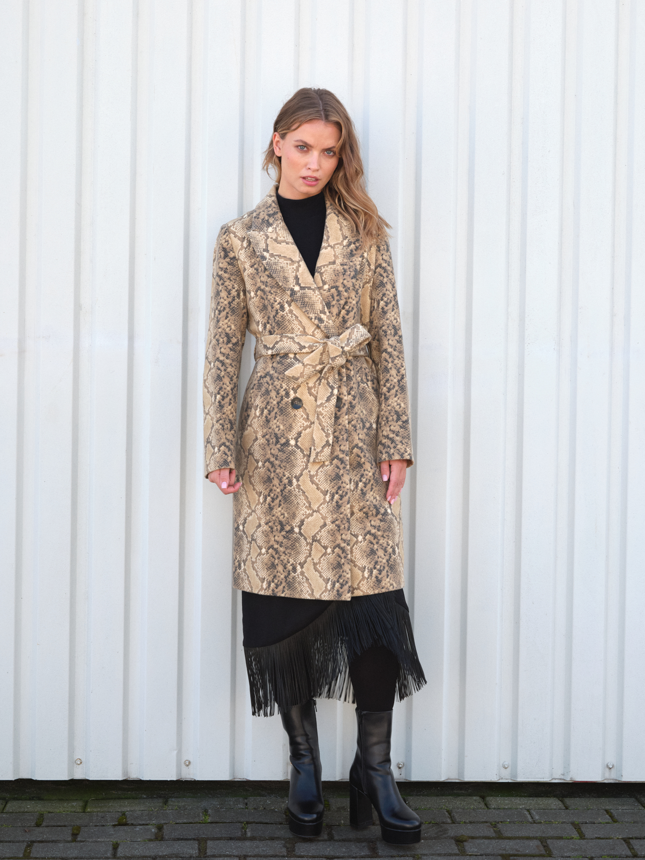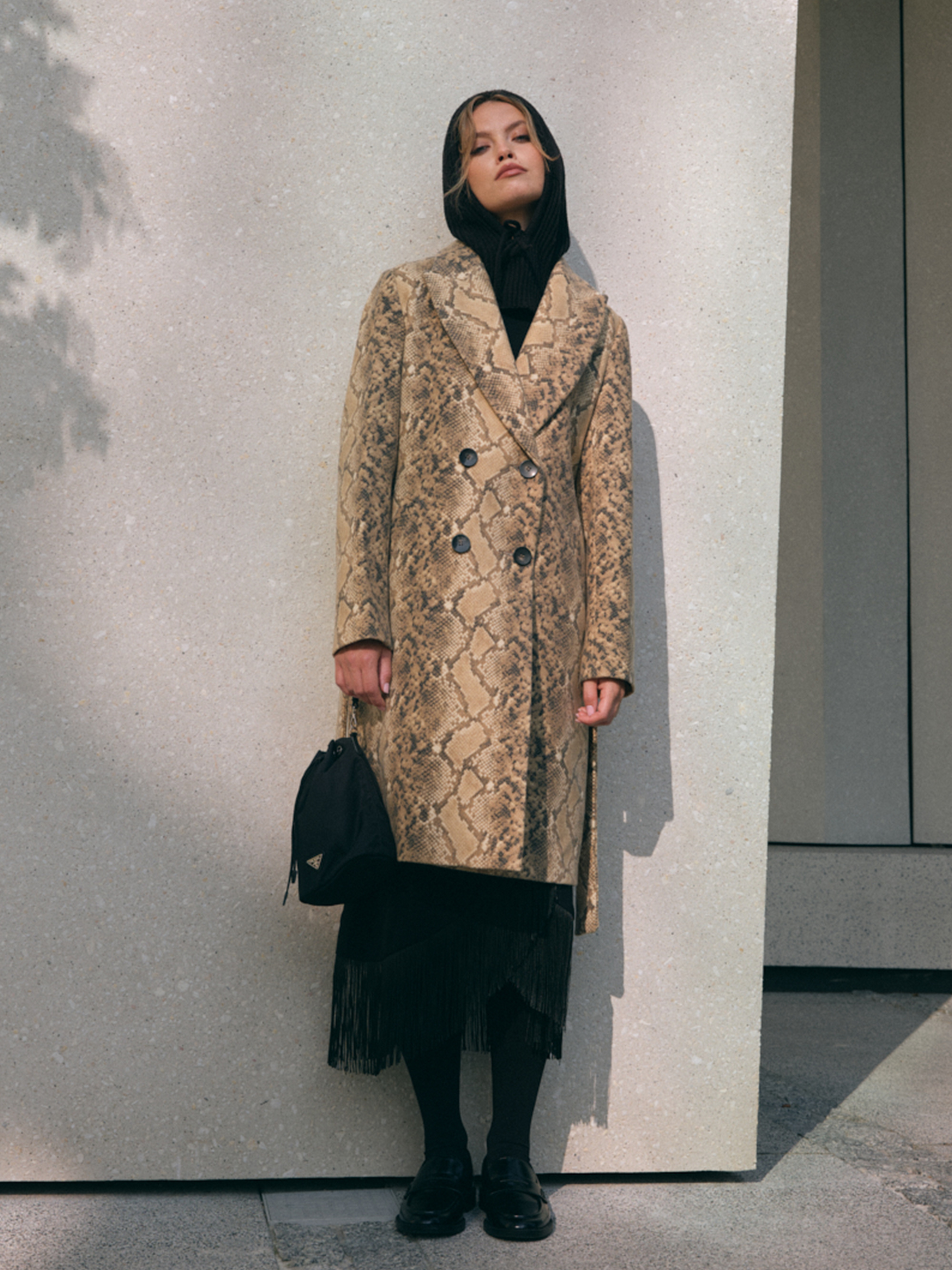 Classic wool coat in snakeskin print Prague to inwestycja w styl, który nie przemija. Jest nie tylko modny, ale i praktyczny – wyróżnia, nie przesadzając. Wężowy wzór (snake print) pojawia się cyklicznie, w sezonie 2025 powraca z nową siłą, jako symbol elegancji, niezależności i buntu wobec nudy.