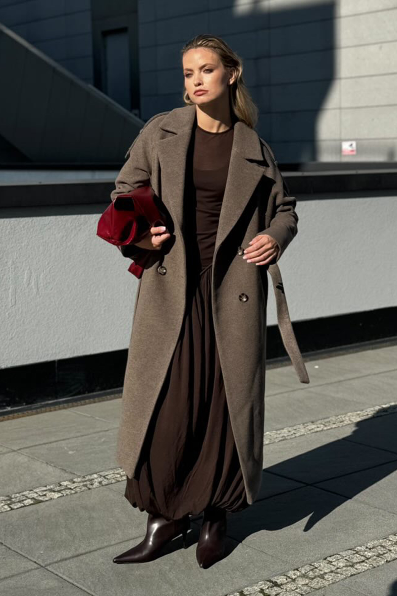 Długi zimowy płaszcz o nowoczesnym kroju, uszyty z mięsistej tkaniny z przewagą wełny. W przepięknym wszechstronnym kolorze brązu o szarawym odcieniu. Wygodny i ciepły.