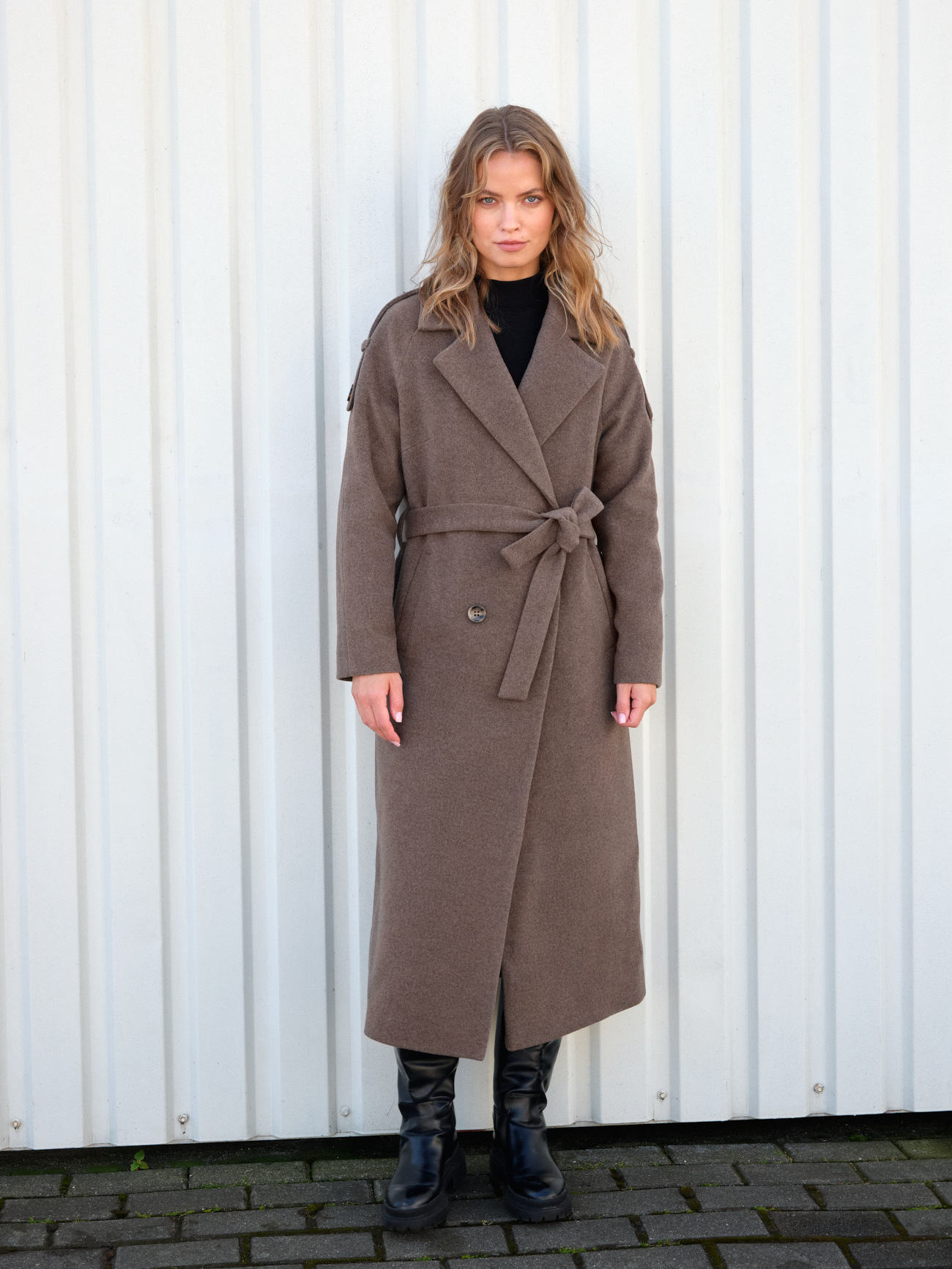 Projekując płaszcz, poza kolorem czarnym i czekoladowym, sięgnęliśmy po mniej spotykany, a naszym zdaniem bardziej wszechstronny i dający nieograniczone możliwości w tworzeniu stylizacji – kolor kamienny. Jest to odcień brązu o szarawym odcieniu, który przypomina naturalny kamień. Jest on bardzo praktyczny i przy niewielkim wysiłku przeistacza się z codziennego na bardzo stylowy i elegancki