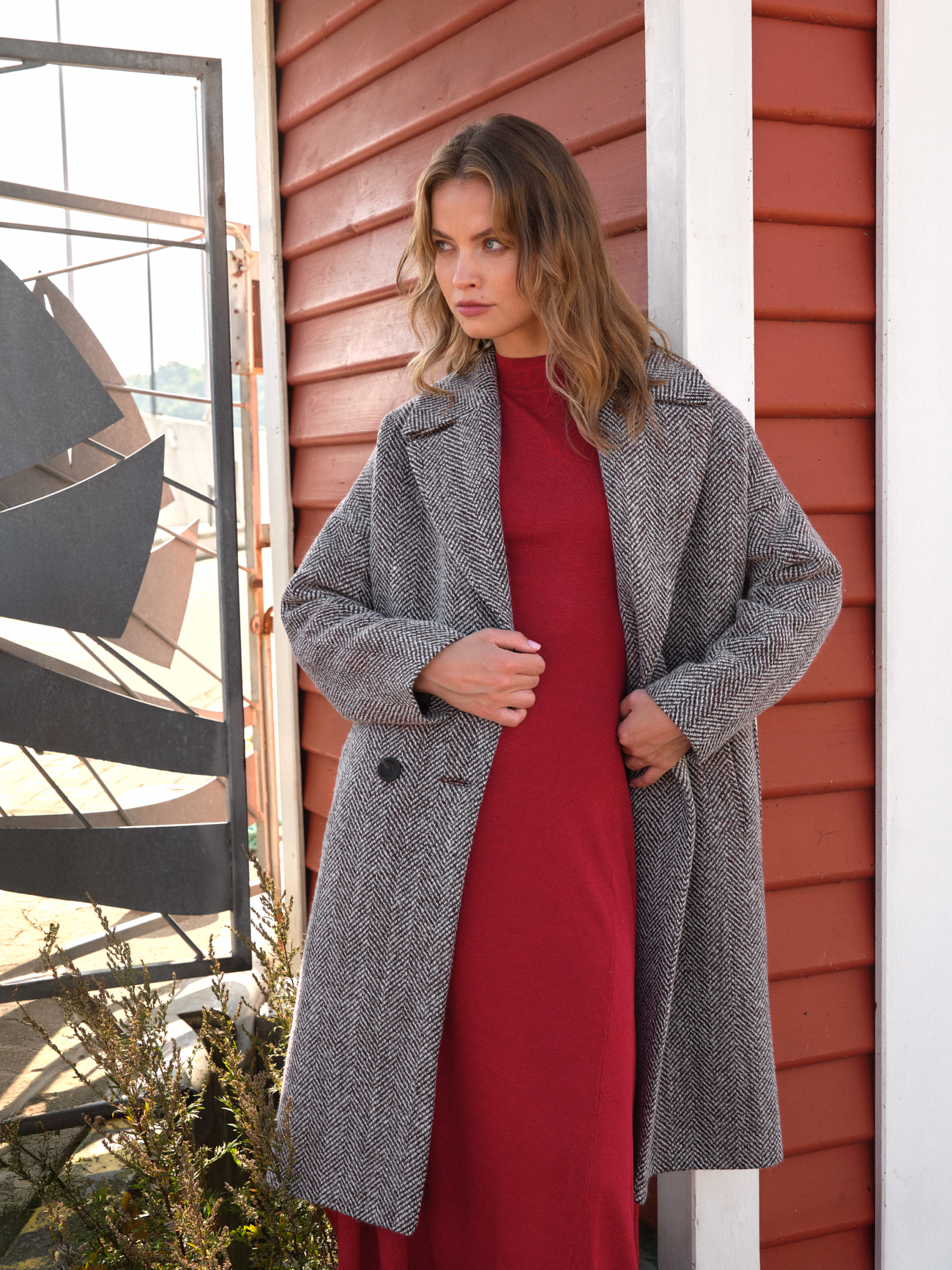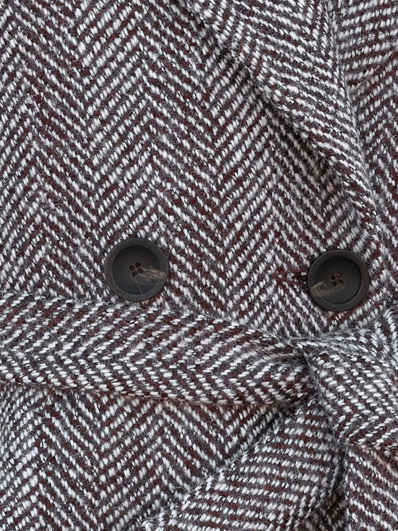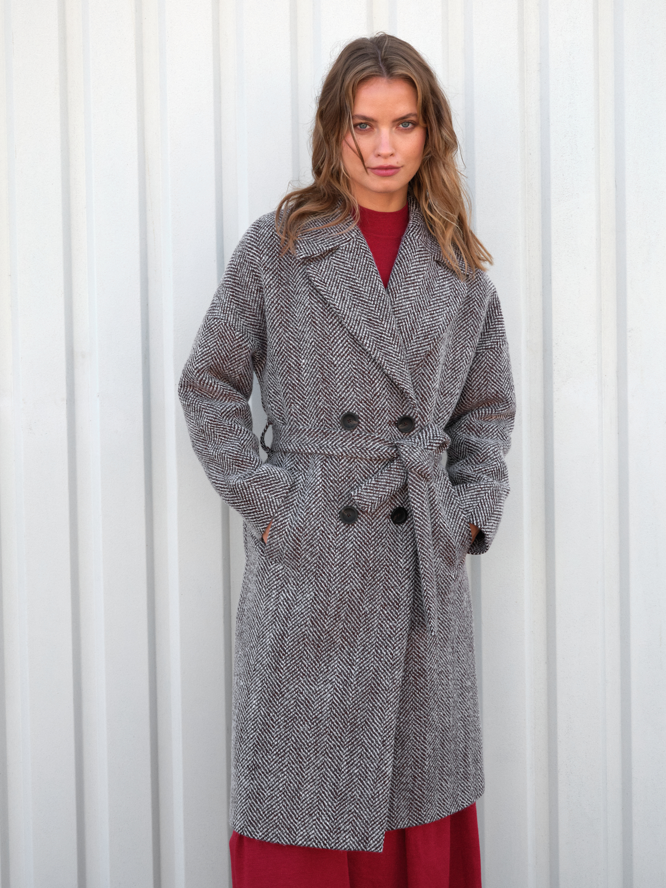 Oversizowy płaszcz zimowy w czekoladowo-białą jodełkę Florence to model o zrelaksowanym kroju. Górna część ma luźniejszą formę, co nadaje całości swobodny, nowoczesny charakter. Jeśli preferujesz bardziej dopasowany fason, rekomendujemy wybór rozmiaru mniejszego niż standardowy. Cały urok tego modelu tkwi jednak w jego niezobowiązującym, lekkim przeskalowaniu.