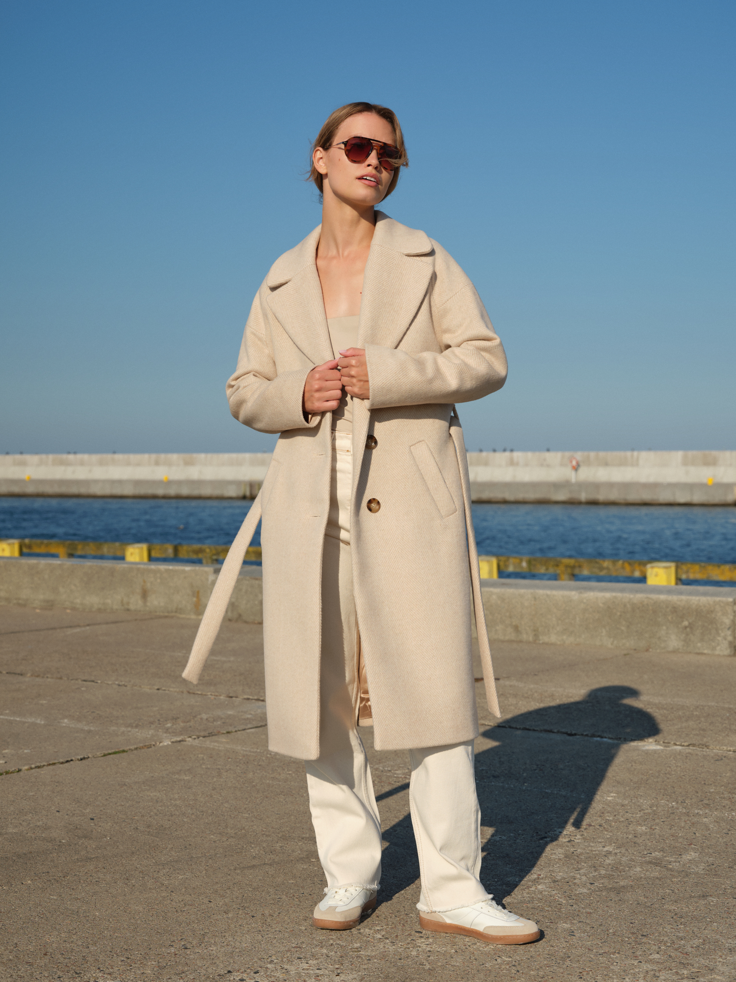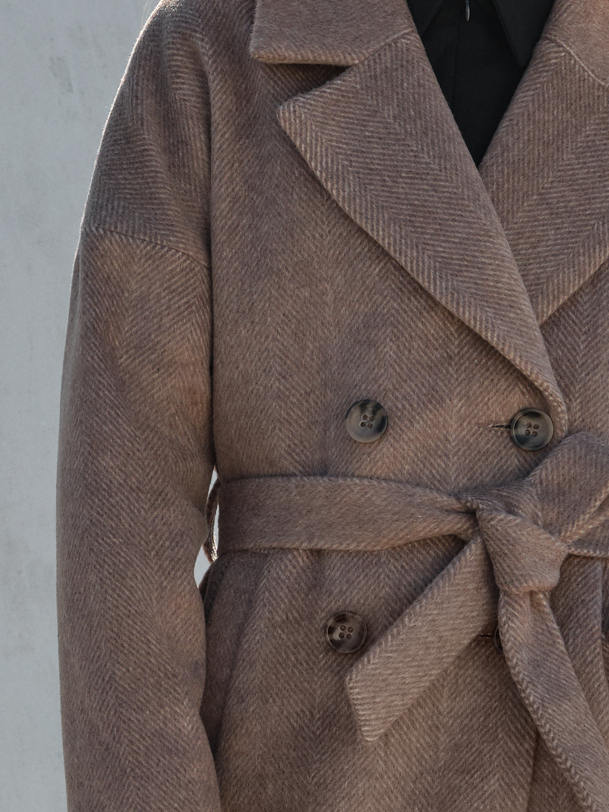 Płaszcz dostępny w następujących kolorach: jodełka beżowa, jodełka mokka (tylko XS, M)