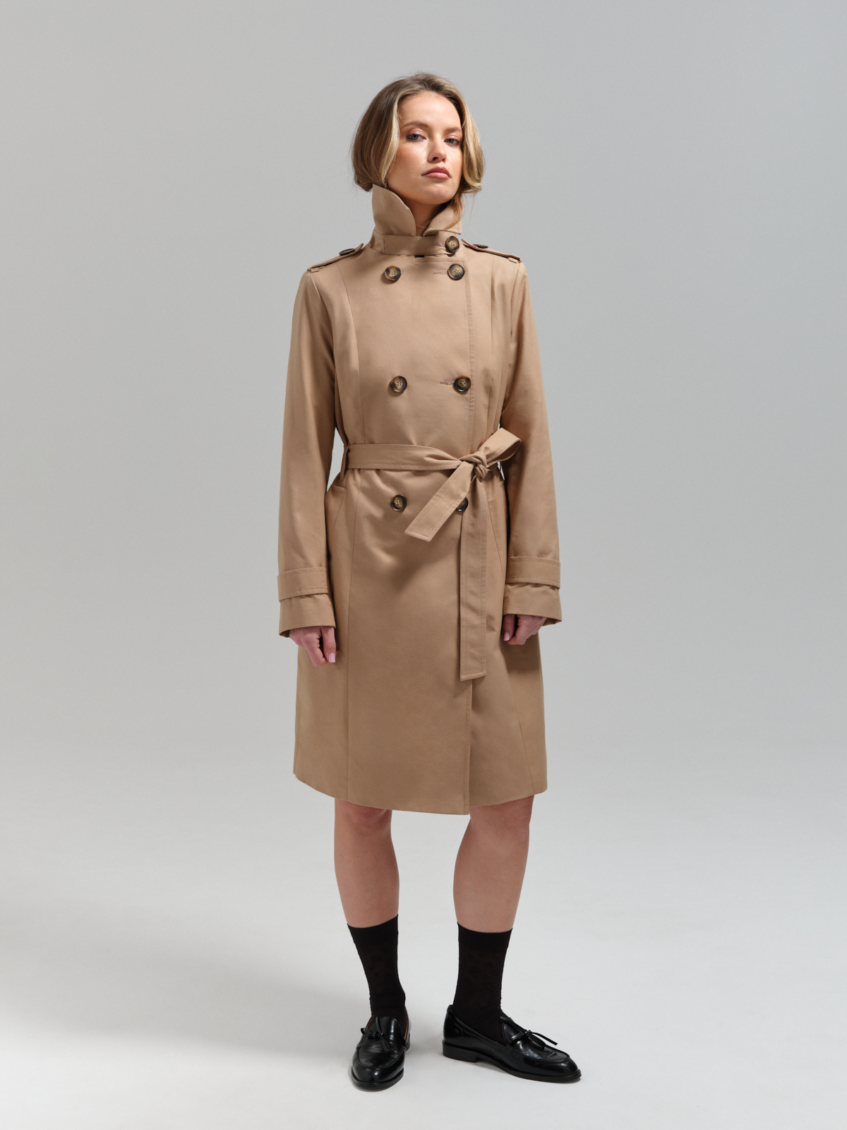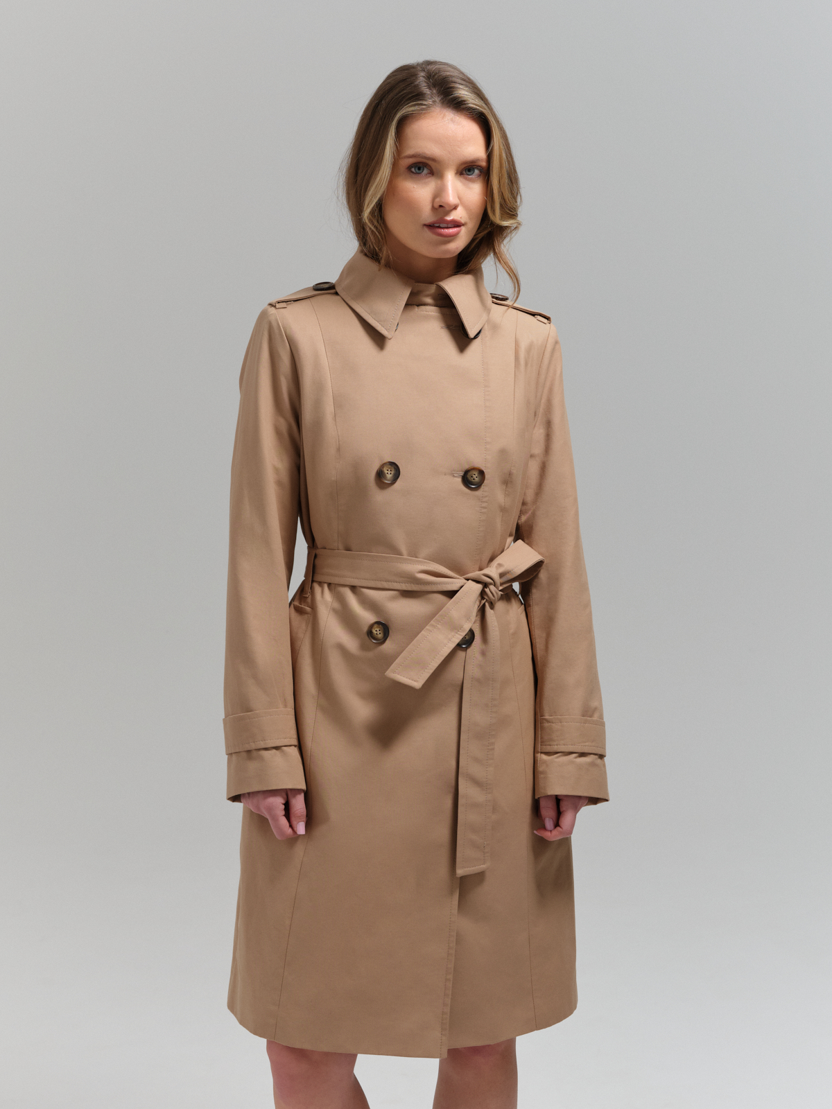 Beżowy dwurzędowy prochowiec z mieszanki bawełny Chester to must-have w wiosennej i jesiennej szafie kapsułowej. Dopasowany płaszczyk z dwurzędowym zapięciem na guziki. Chester ma wykładany kołnierz na stójce, zwany kołnierzem koszulowym, który nadaje elegancki, a jednocześnie ponadczasowy charakter. Można go zapiąć wysoko lub postawić, by osłonić się przed chłodnymi powiewami wiatru. Z kolei w słoneczne, pogodne dni – wyłożyć klapy tworząc efektowny rewers. Modnie i funkcjonalnie. Pasek można wiązać na różne sposoby, również z tyłu trencza stylizując go na sposób francuski i optycznie wysmuklając sylwetkę. Prochowiec jest lekko poszerzany ku dołowi. Tył płaszcza z rozporkiem na dole. Ramiona i rękawy wykończone ozdobnymi patkami z guzikiem. Z przodu, po bokach dwie praktyczne kieszenie. Beżowy dwurzędowy prochowiec uszyliśmy z mieszanki bawełny pokrytej hydrofobową warstwą oraz oddychającej podszewki.