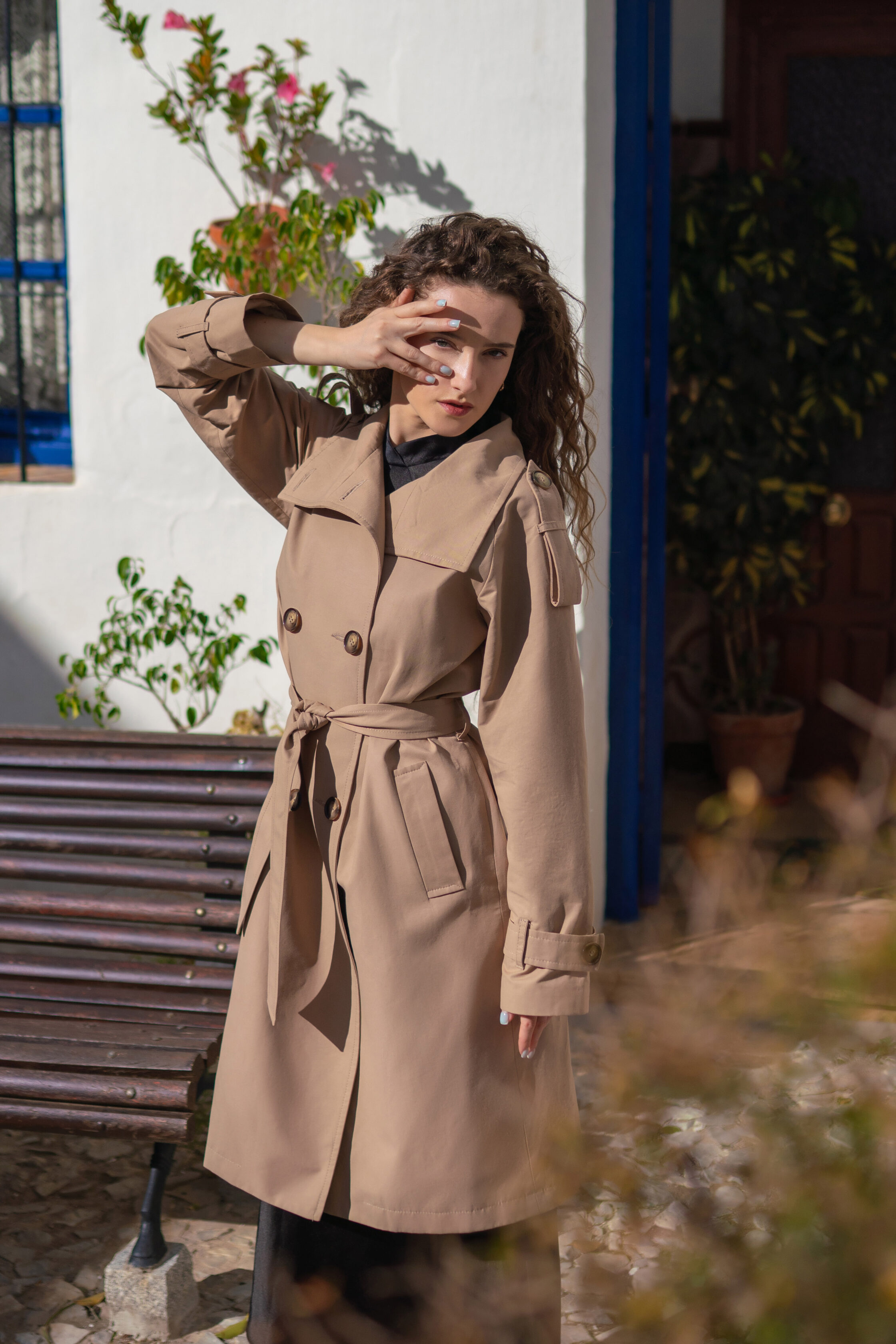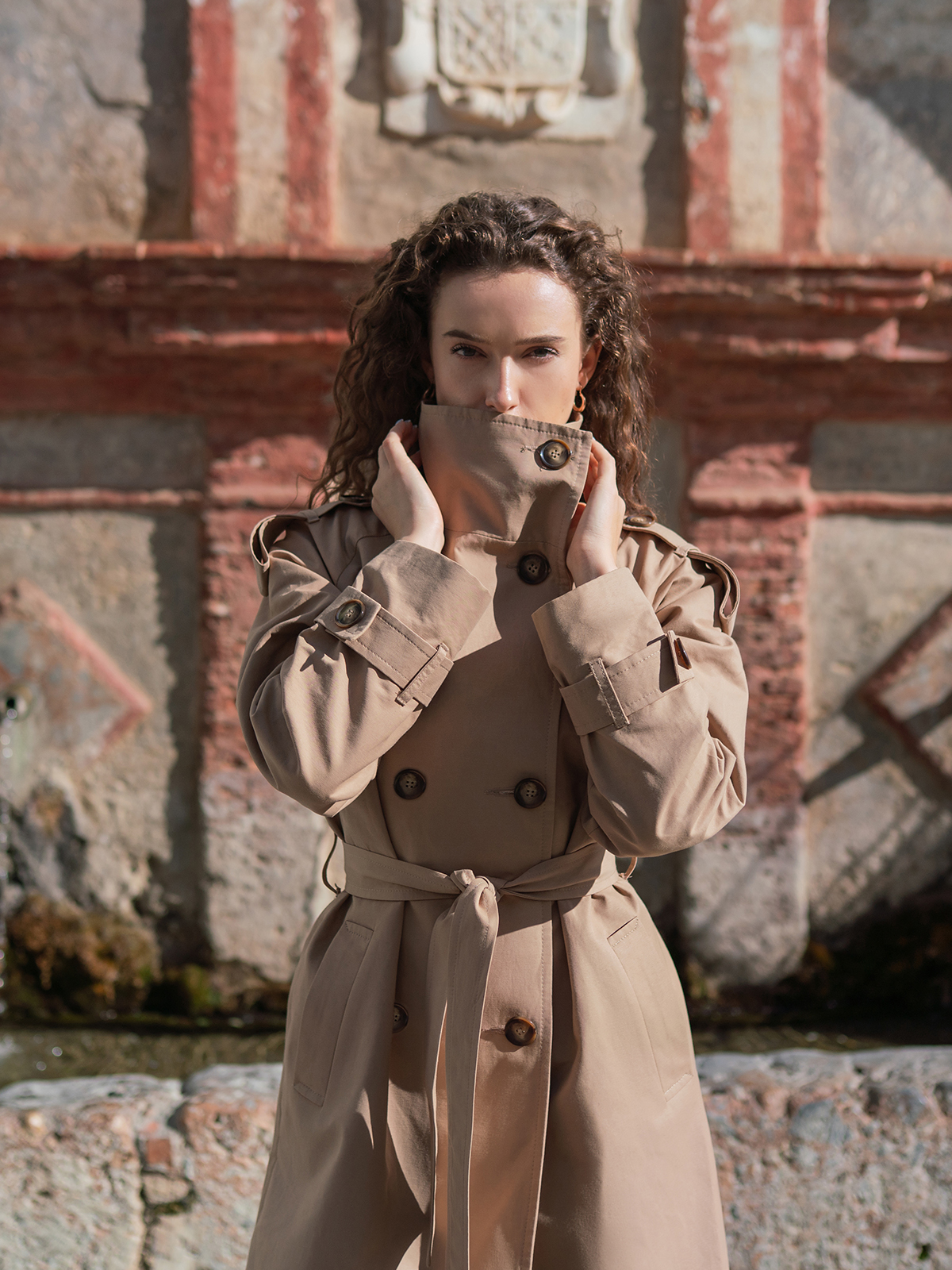 Beżowy trencz midi z wysokim kołnierzem Ina to nasza najnowsza odsłona klasycznego prochowca o swobodnym kroju. Trend high collar nie kończy się tylko na płaszczach zimowych — coraz częściej pojawia się w przejściowych wersjach płaszczy i kurtek. Modele z wysokim kołnierzem nie tylko otulają i chronią przed zimnem, ale również nadają sylwetce nowoczesny i minimalistyczny charakter. Dlatego architektoniczne kołnierze coraz częściej pojawiają się w lżejszych stylizacjach. W naszym trenczu Ina efekt wysokiego kołnierza uzyskaliśmy poprzez dodanie zapinanej na guziki stójki, która podpięta – przypomina kształtem golf. Po rozpięciu – tworzy tradycyjny, wykładany kołnierz. To właśnie finezyjna konstrukcja kołnierza oraz asymetryczne, delikatnie przesunięte na bok, zapięcie (częściwo jednorzędowe, a częściowo dwurzędowe) pozwoliło nam na subtelne przełamanie klasyki i nadanie całości współczesnego charakteru.