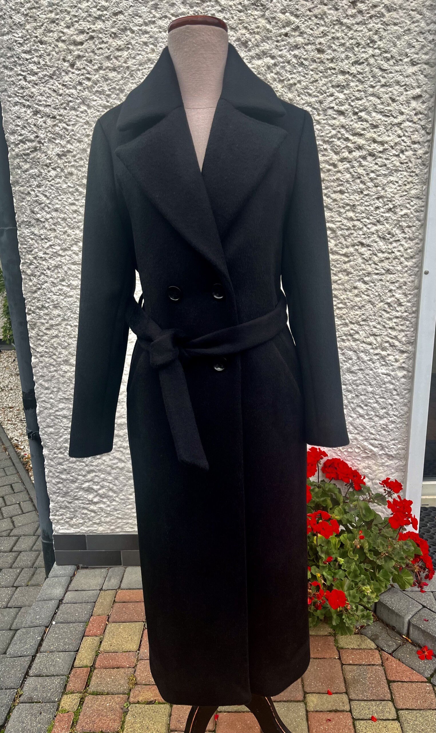 Czarny długi płaszcz z wełny dziewiczej i suri alpaki Lana to minimalistyczny i ikoniczny model, uszyty z przepięknej, grubej i mięsistej tkaniny z długim włosem. Szlachetną jakość materiału uwypukla naturalny, subtelny połysk, który wydobywa głębię czerni. Przody płaszcza zostały dodatkowo podklejone bardzo delikatną klejonką, stabilizująca włókna, podkreślającą właściwości tkaniny i luksusowy wygląd płaszcza. Płaszcz ma klasycznie wszywane rękawy oraz wykładany kołnierz z klapami. Taliowany tył z wydłużającym sylwetkę rozporkiem, profilowany przód, dwurzędowe zapięcie na szylkretowe guziki. Dwie, boczne kieszenie zakończone listewką. I całość wiązana paskiem, uszytym z tego samego materiału. Długość do połowy łydki. Płaszcz w całości na wiskozowej podszewce w piękny wzór. Pasek świetnie zbuduje talię a podniesiony kołnierz ochroni przed wiatrem. Wełniana tkanina zapewni optymalny komfort termiczny, chroniąc przed chłodem i wilgocią. Doskonała propozycja na zimę.