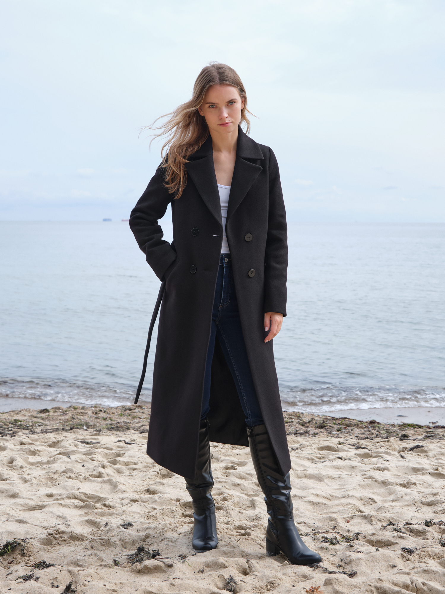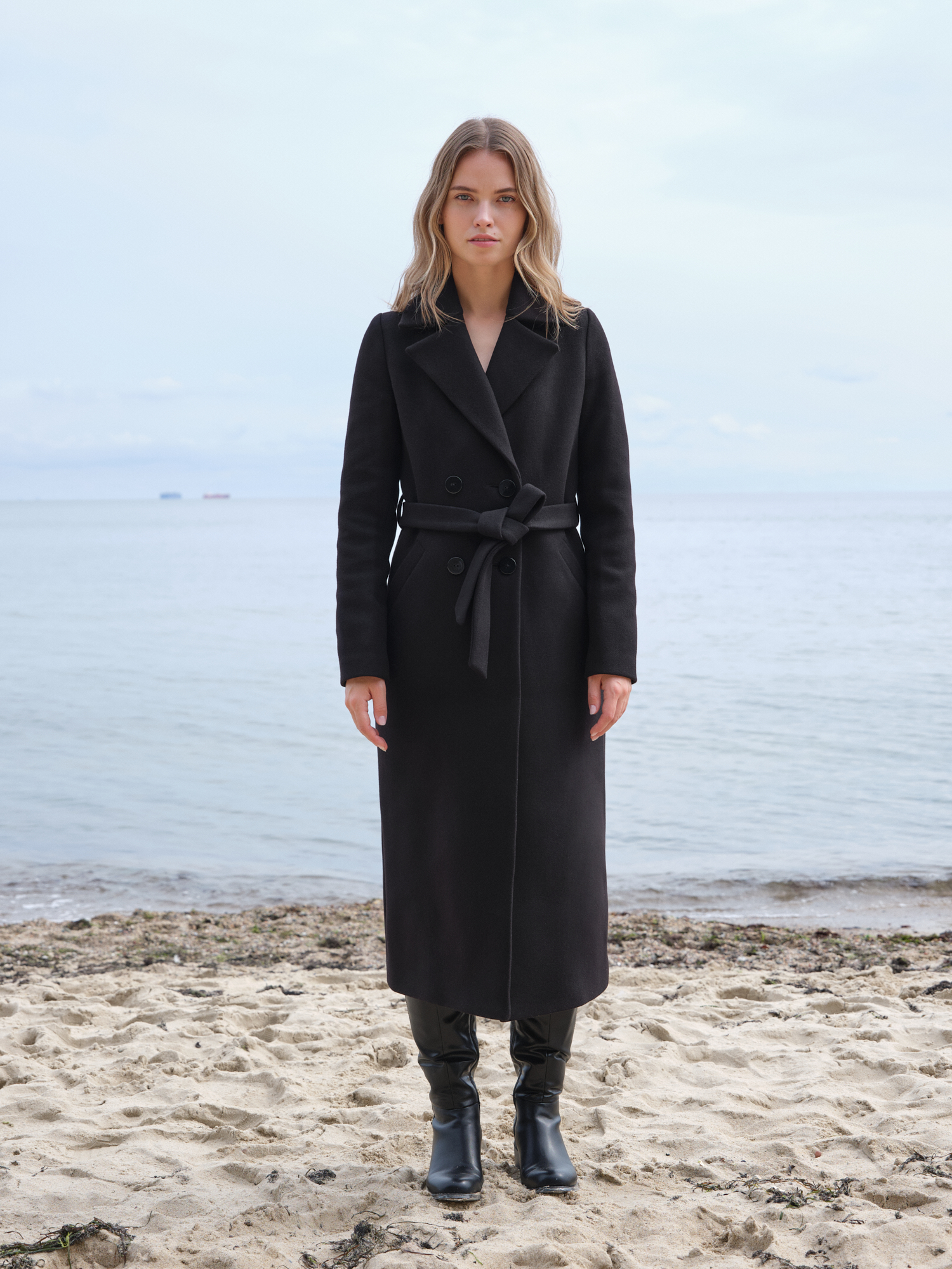 Pasek świetnie zbuduje talię a podniesiony kołnierz ochroni przed wiatrem. Wełniana tkanina zapewni optymalny komfort termiczny, chroniąc przed chłodem i wilgocią. Doskonała propozycja na zimę, dodająca każdej stylizacji wyrafinowanego charakteru. Odkryj nasz czarny dopasowany długi płaszcz Como i zachwyć się jakością wykonania, ciepłem i miękkością.