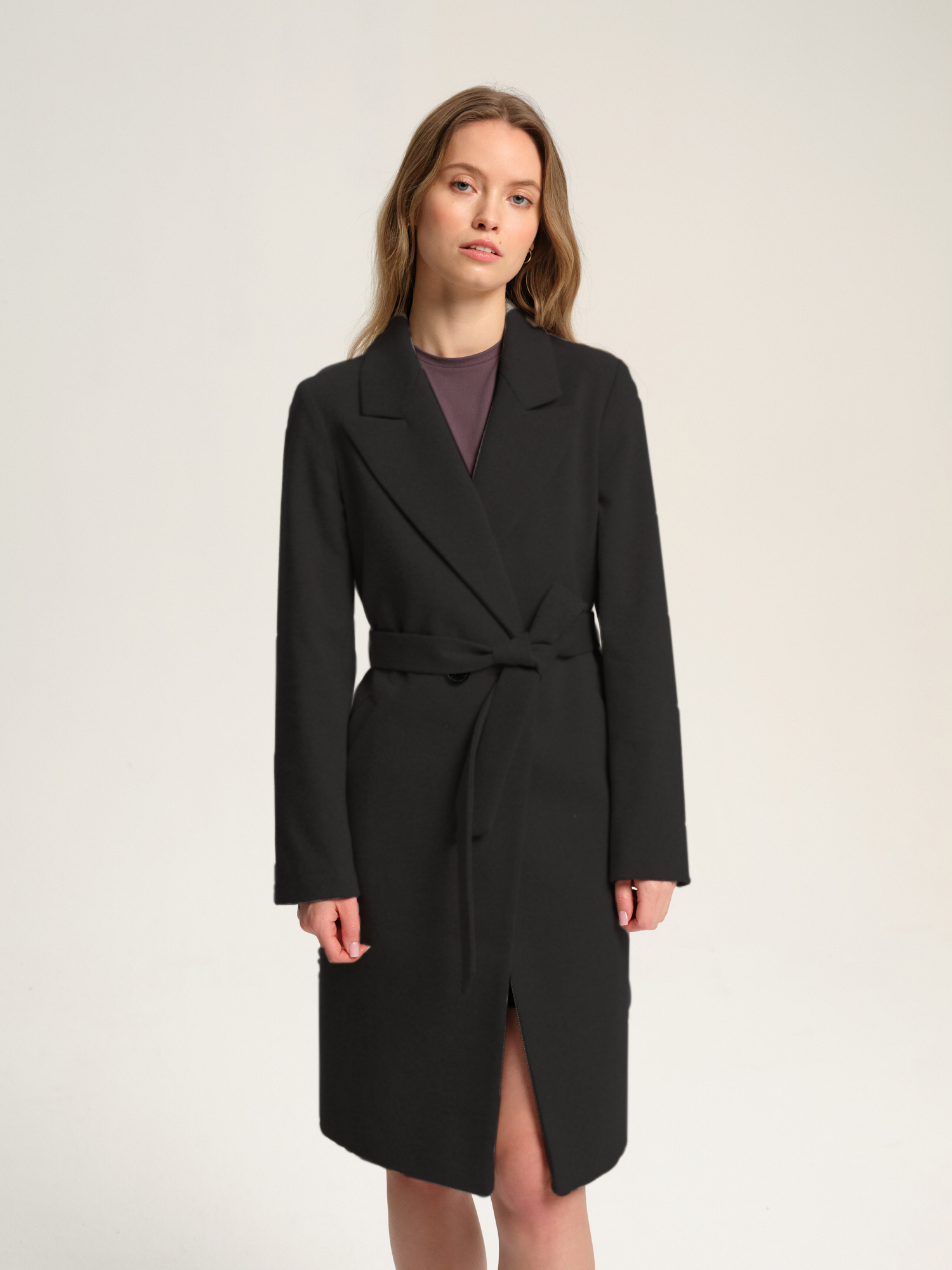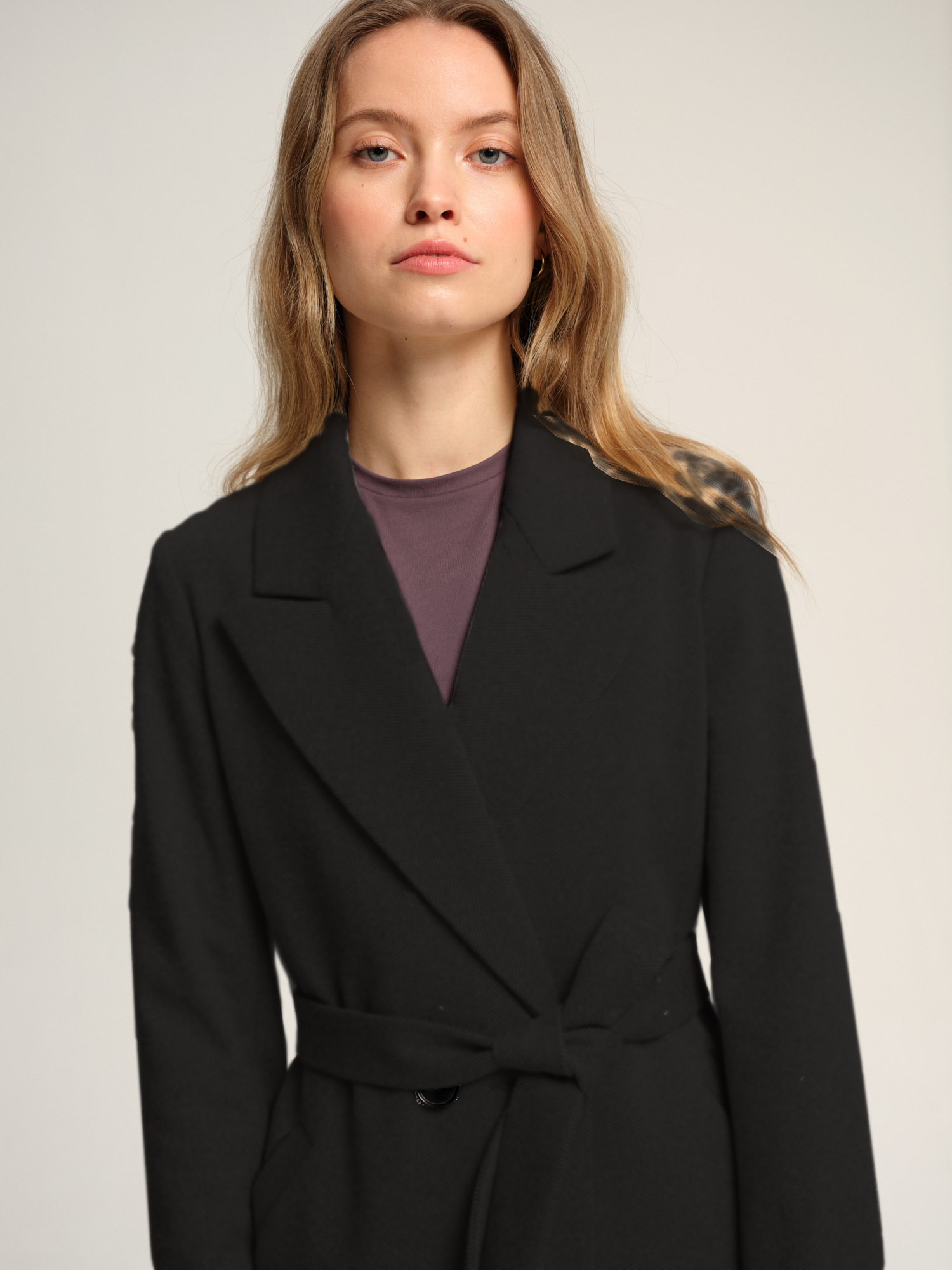Czarny płaszcz taliowany do kolan z paskiem Ada