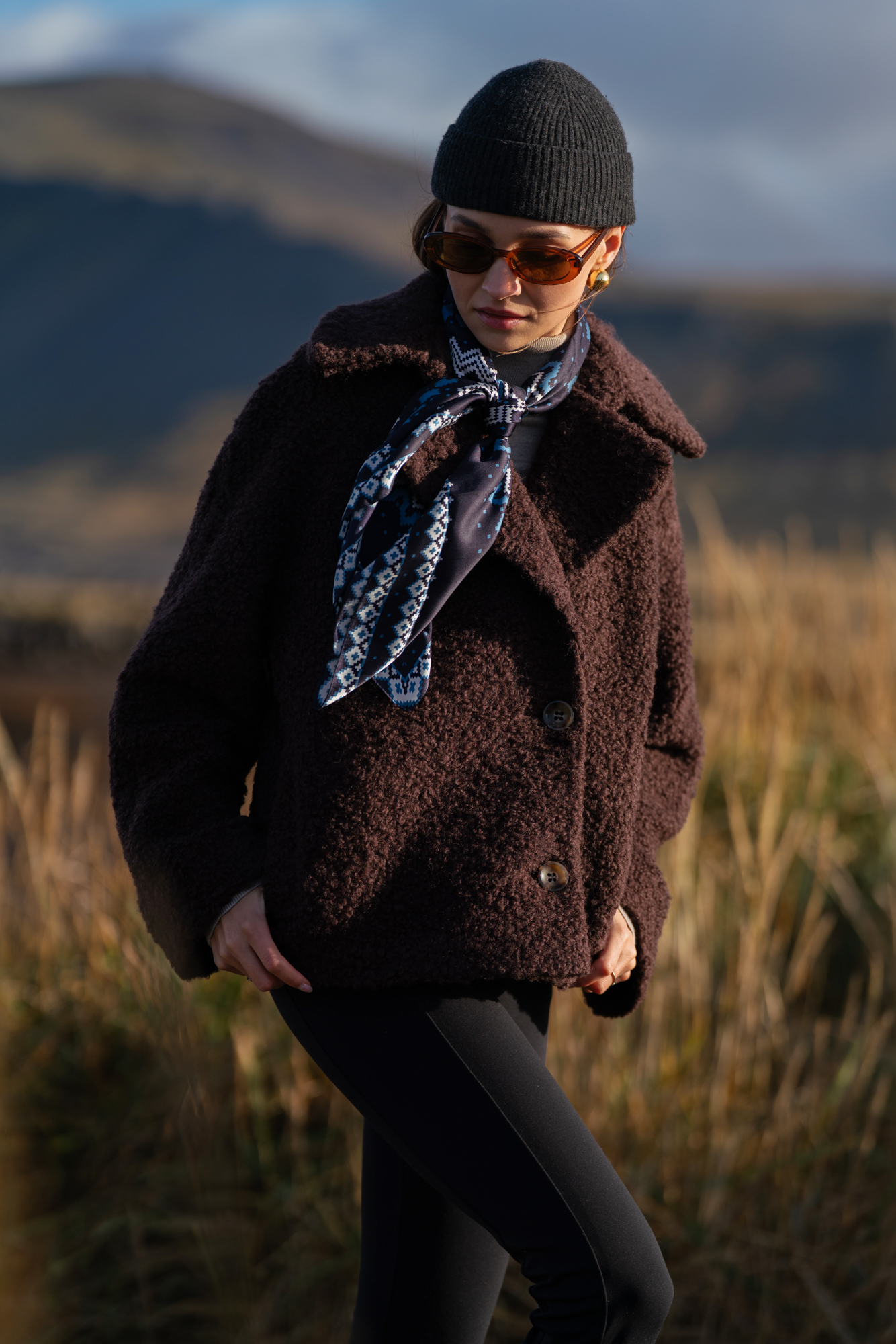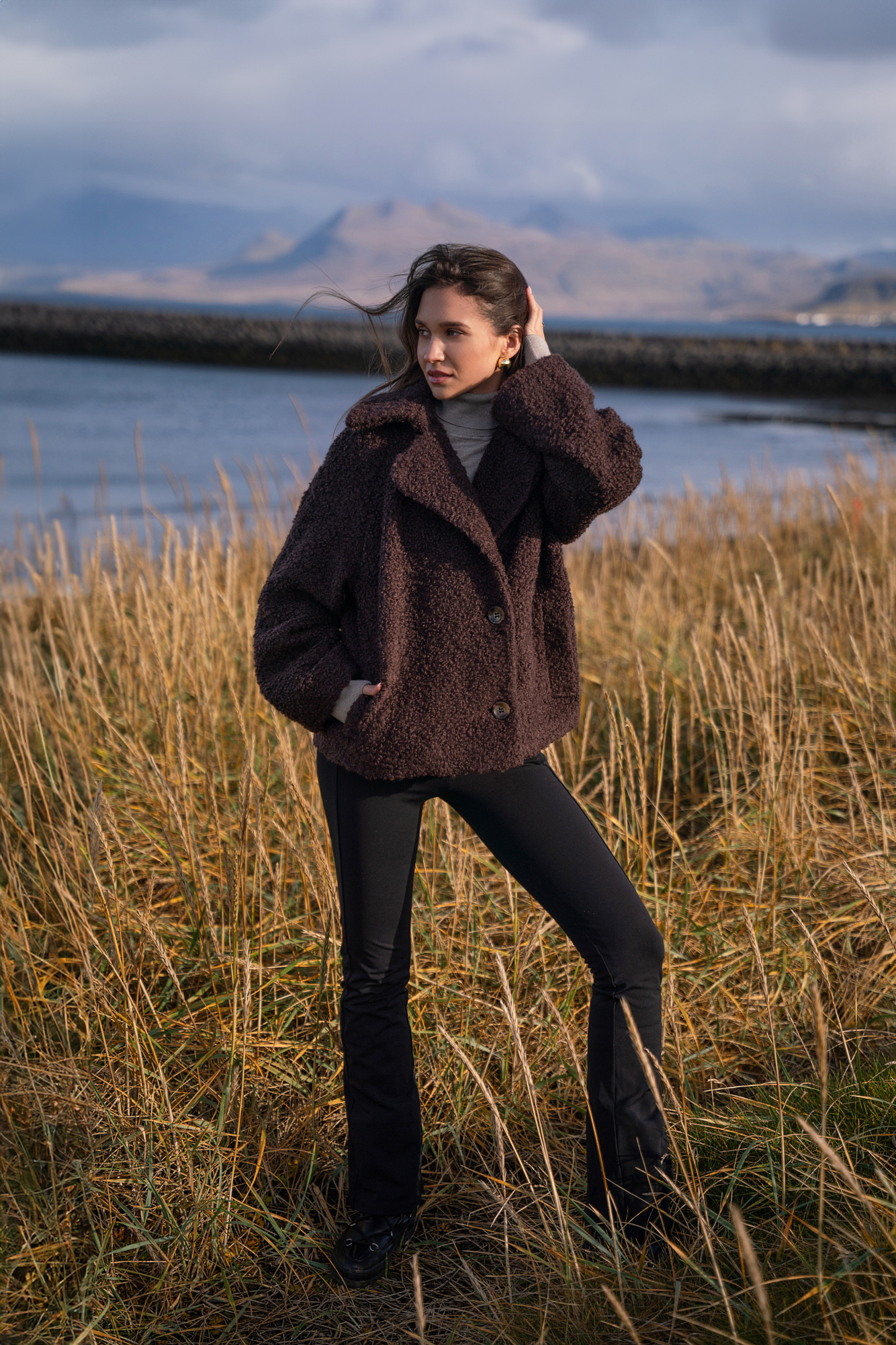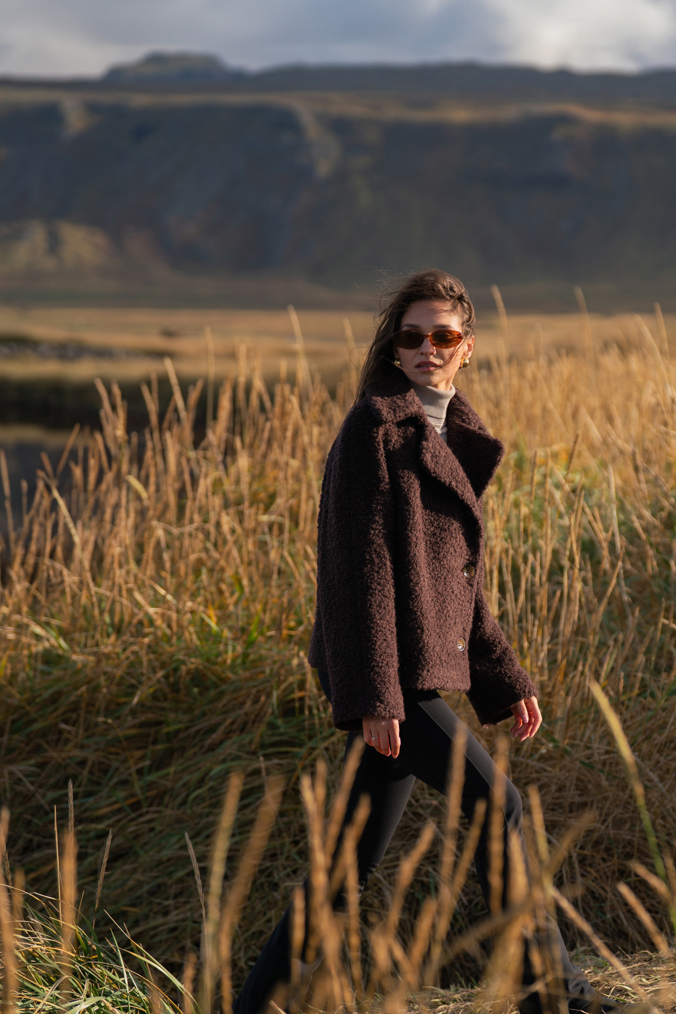 Czekoladowa kurtka damska oversize z wełny Hana to krótka kurtka w stylu bomberki. Delikatnie luźniejsza, z miękkiej wełny boucle i w zachwycającym czekoladowym odcieniu.
