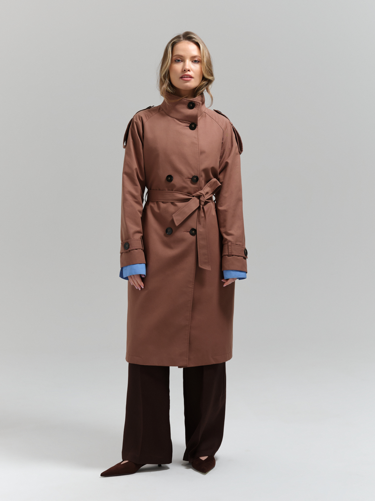 Czekoladowy trencz damski o luźym kroju Ina to nowoczesna odsłona klasycznego bawełnianego trencza. Styl oversize, wysoki architektoniczny kołnierz, asymetryczne zapięcie i czysta forma.