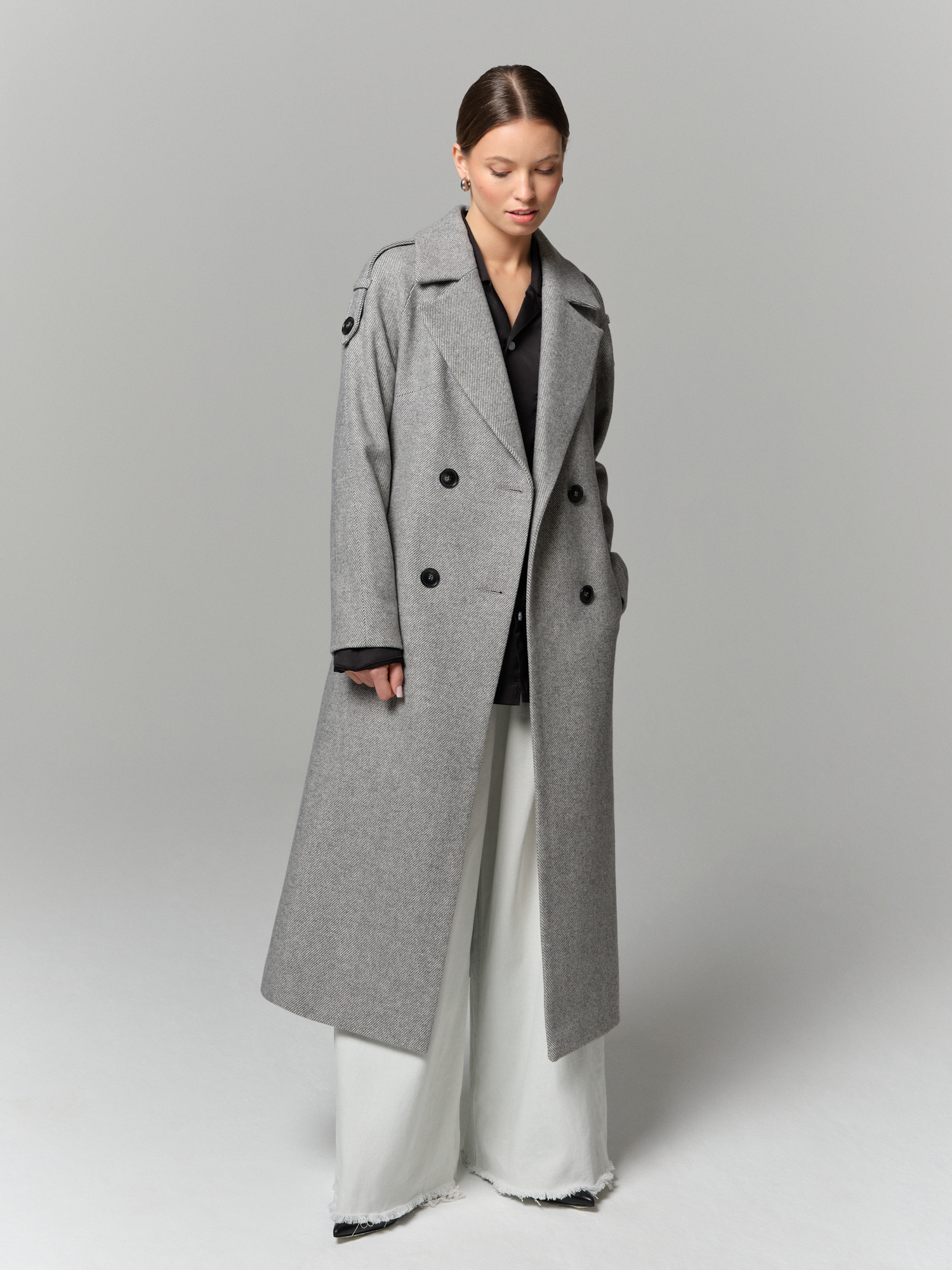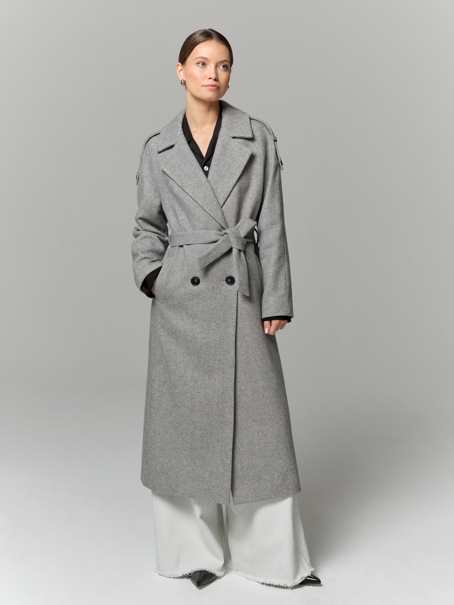 Płaszcz ma raglanowe, długie rękawy, wykładany kołnierz, ozdobne pagony na ramionach i dwie, boczne kieszenie wykończone listewką. Zapinany jest dwurzędowo na guziki i wiązany w pasie. Długość do połowy łydki z rozporkiem na tyle, który nie tylko dodaje elegancji, ale i funkcjonalności.