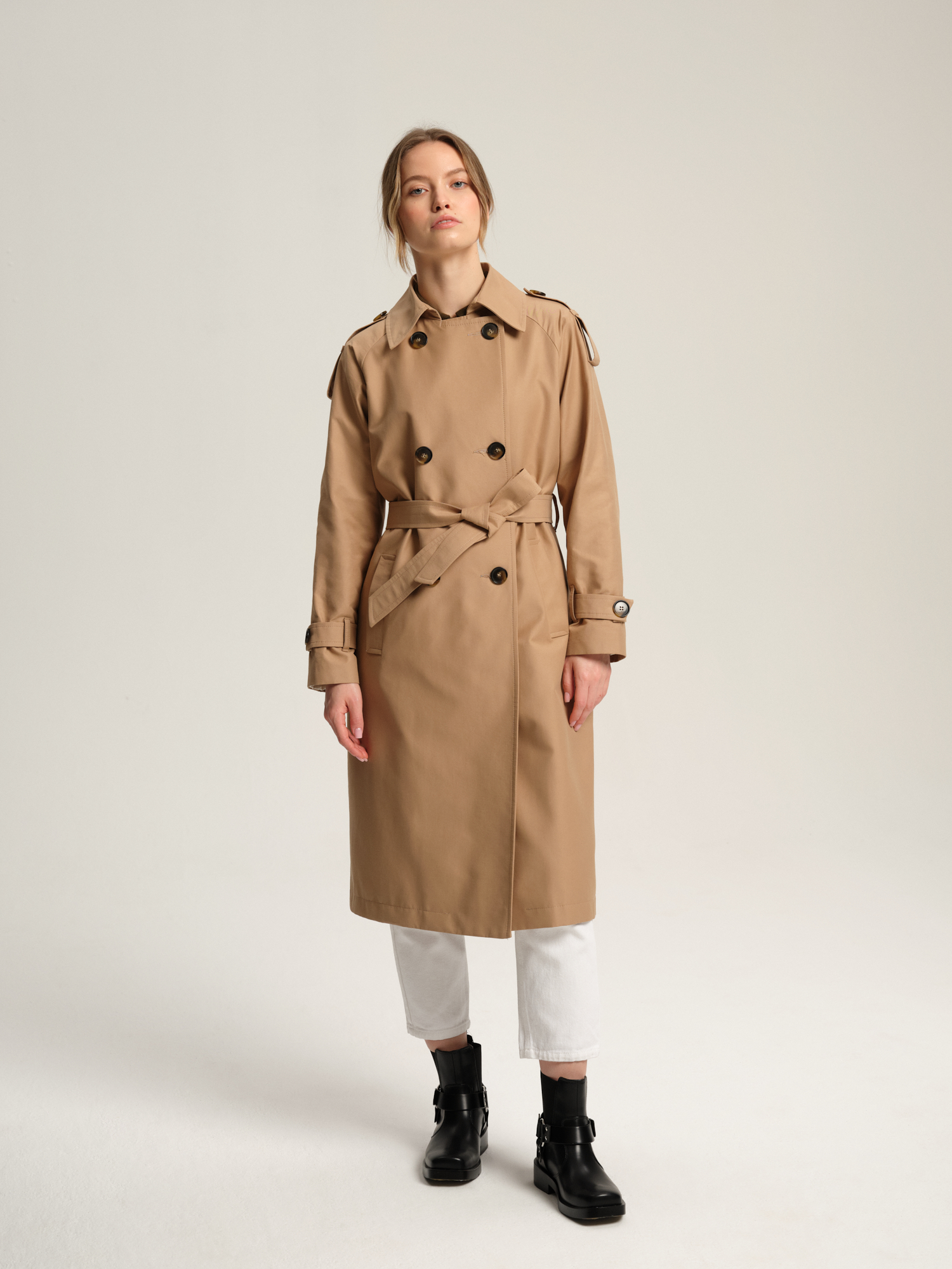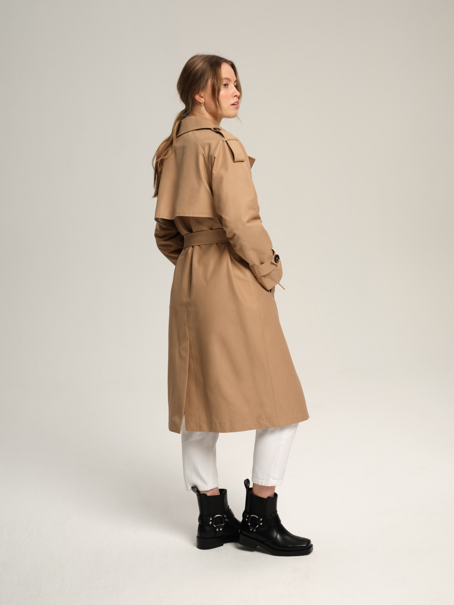 Długi trencz oversize z paskiem Stella o kroju klasycznego, dwurzędowego prochowca z peleryną na plecach. Płaszcz jest profilowany, jednak z uwagi na raglanowe wykończenie rękawów wypada luźniejszy (oversizowy). Talię można dodatkowo podkreślić paskiem. Z tyłu na dole ma rozporek. Dobrane kolorystycznie szylkretowe guziki na froncie płaszcza oraz na mankietach. Na ramionach ozdobne pagony z naszytym guzikiem. Dwie ukośne kieszenie zakończone szeroką listwą. Trencz w całości na podszewce. Płaszcz jest luźny, więc jeśli pożądany jest bardziej dopasowany efekt, to sugerujemy wybór mniejszego rozmiaru.