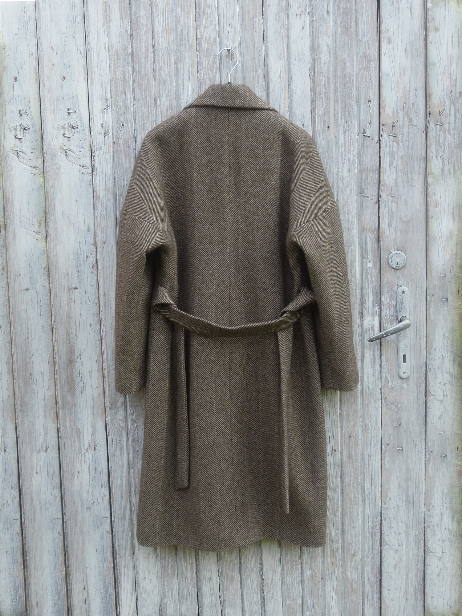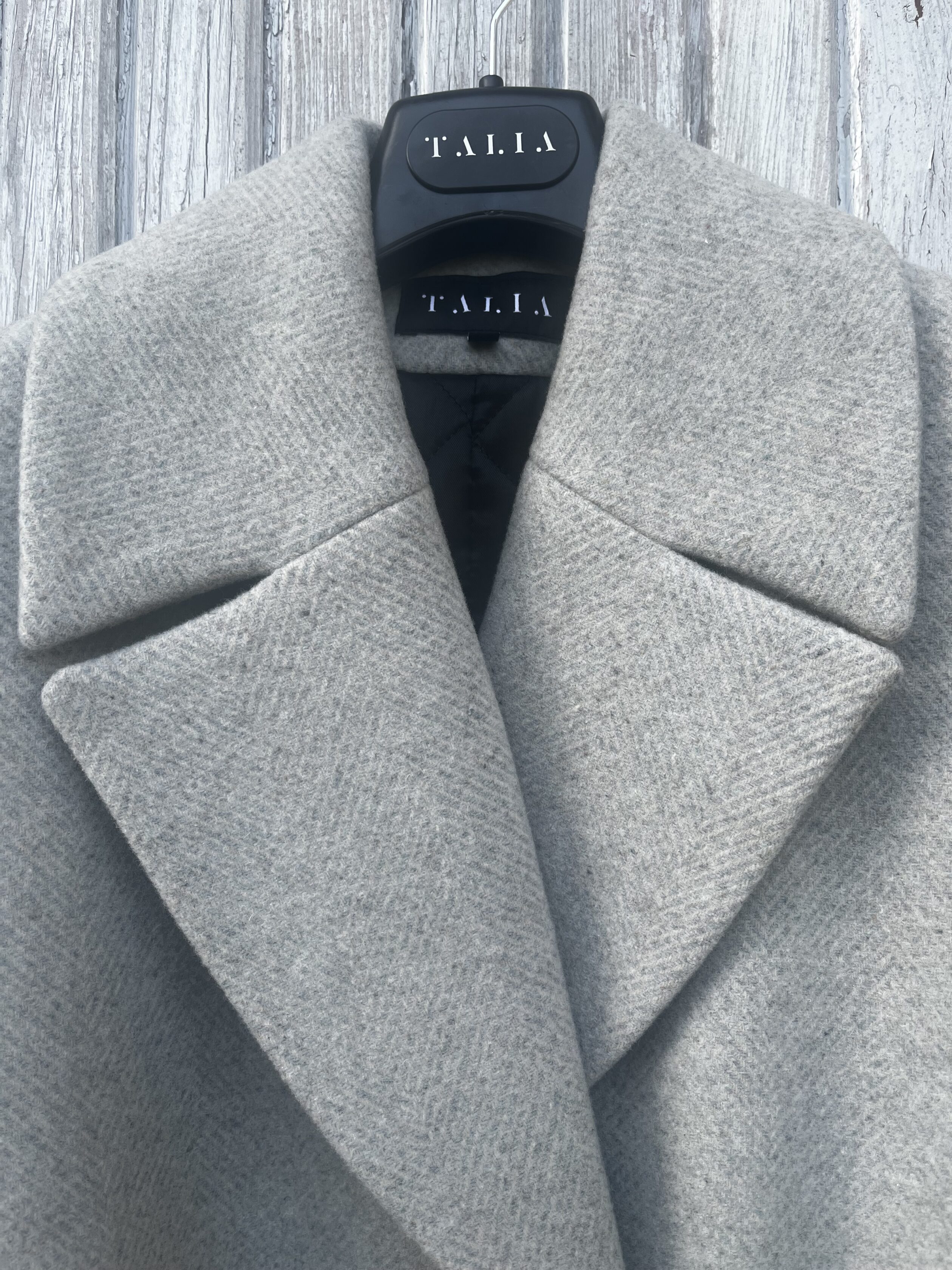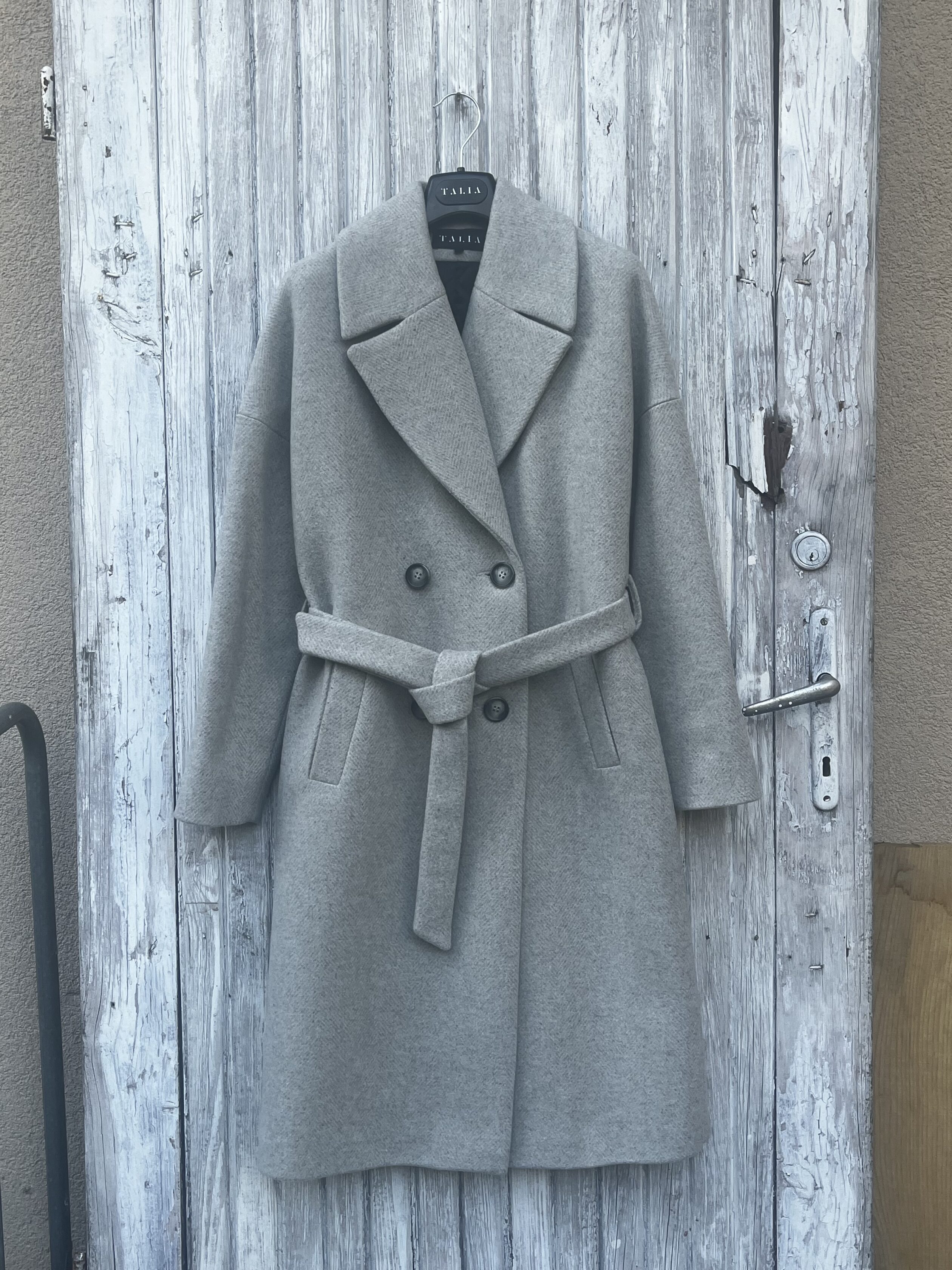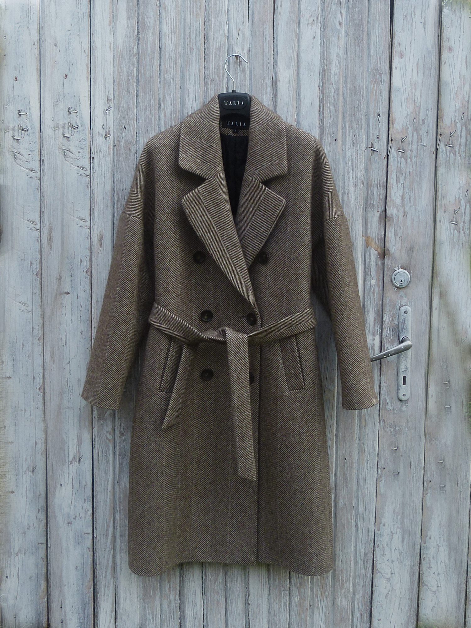 Dostępne kolory: jodełka szaro-beżowa delikatna, jodełka brązowo-beżowa (płaszcz ma dwa rzędy guzików, nie 3)