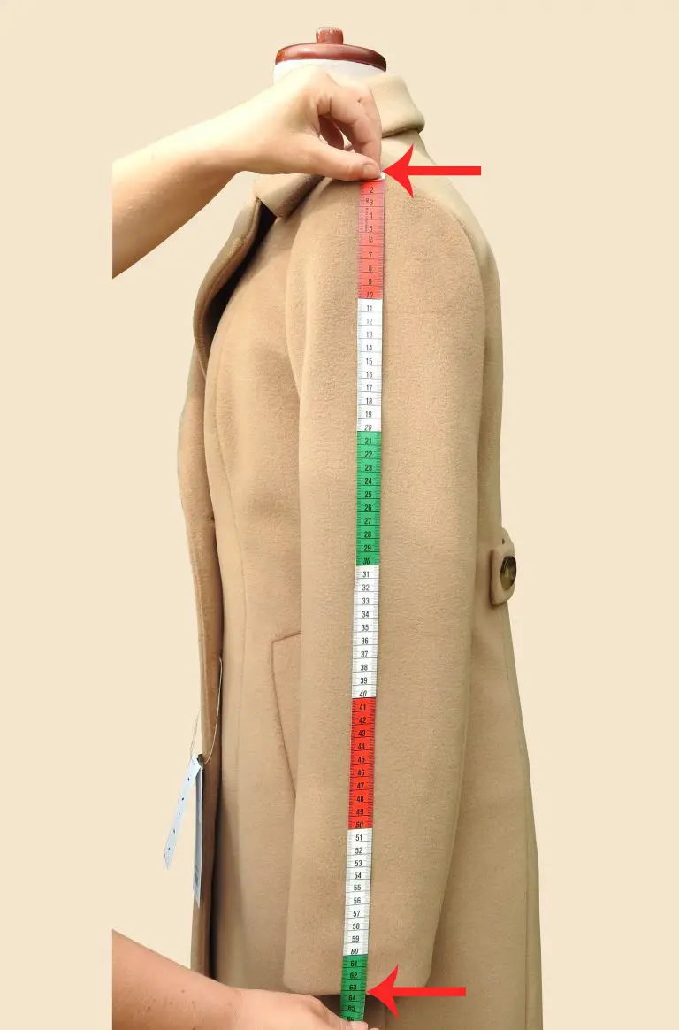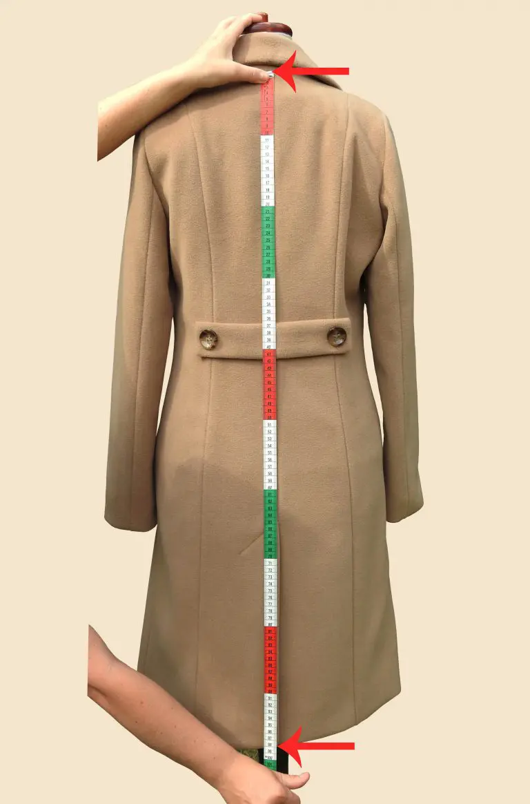 DŁUGOŚĆ CAŁKOWITA PŁASZCZA jest mierzona po linii pleców przez ich środek od końca szyi w dół.
