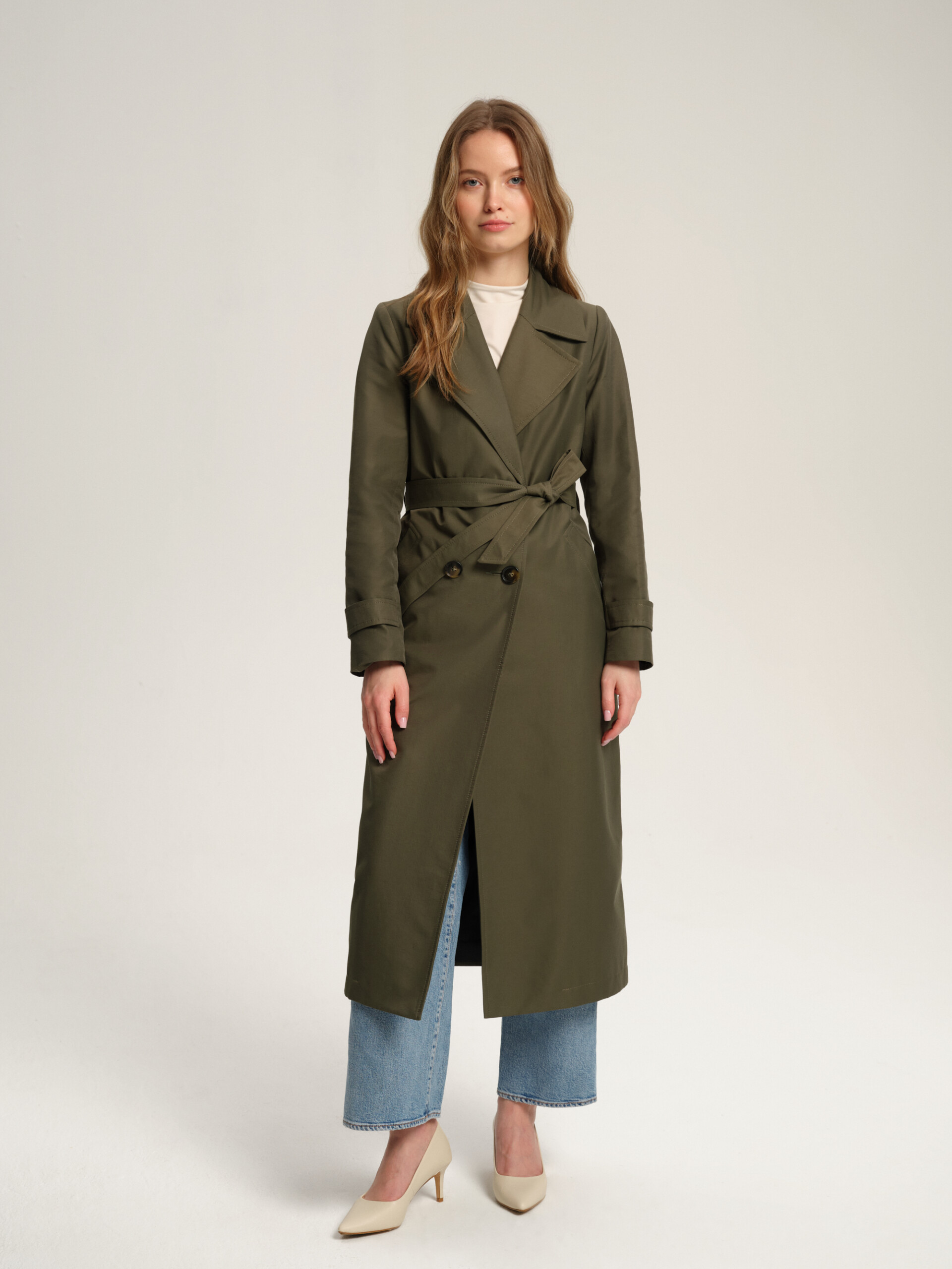 Klasyczna linia tego długiego bawełnianego trencza pozwoli Ci na piękne podkreślenie sylwetki. Wiązany pasek podkreśli Twoją talię a sam płaszcz będzie wyglądał znakomicie zarówno w wersji zapiętej jak i rozpiętej. Płaszcz doskonale pasuje do różnych stylizacji i jest świetną alternatywą dla kurtki typu bomberka oraz marynarki czy ramoneski. Sukienka i szpilki, garnitur i skórzane loafersy na platformie, jeansowe spodnie i białe trampki – wszystko zależy od Ciebie.