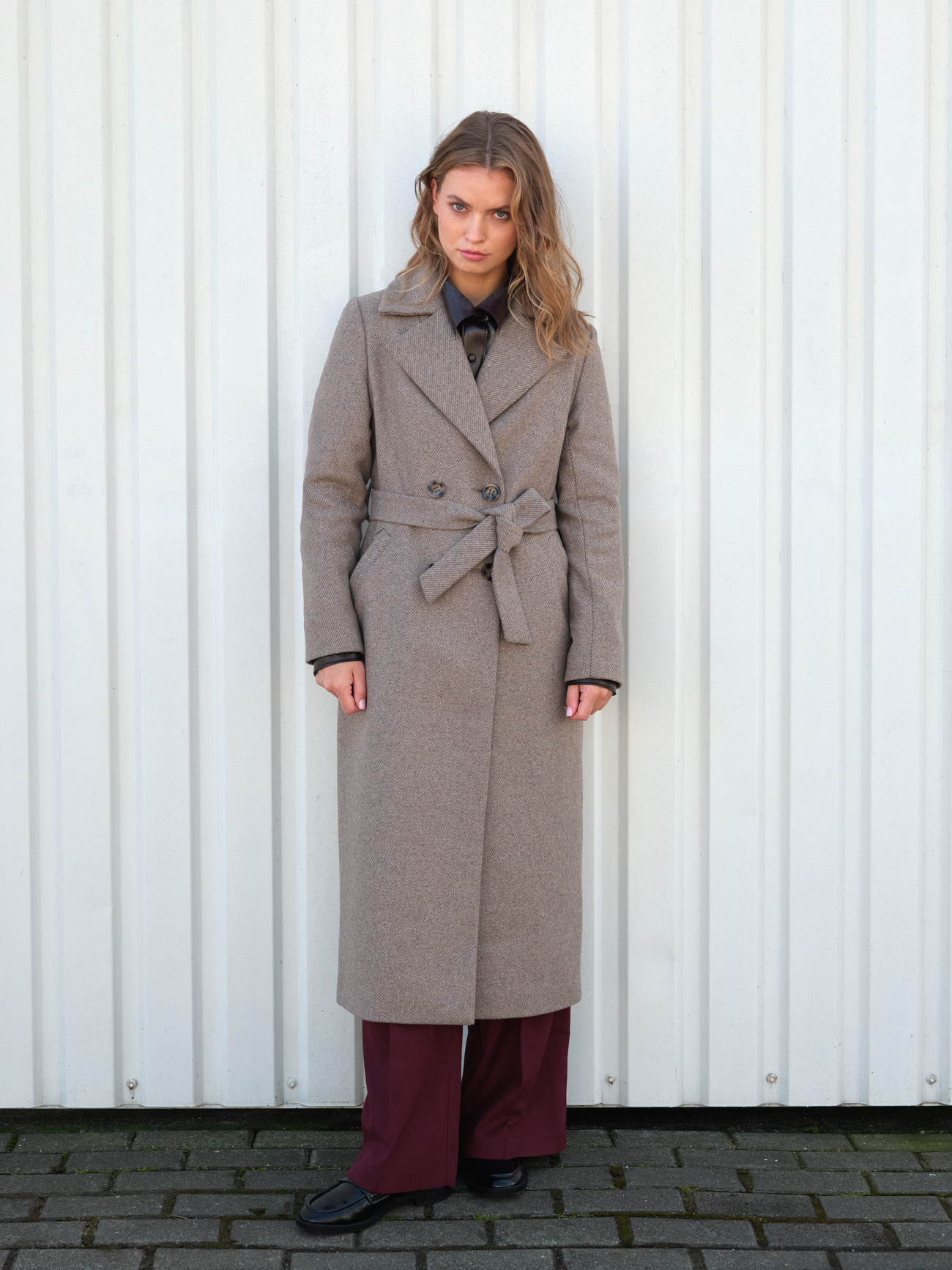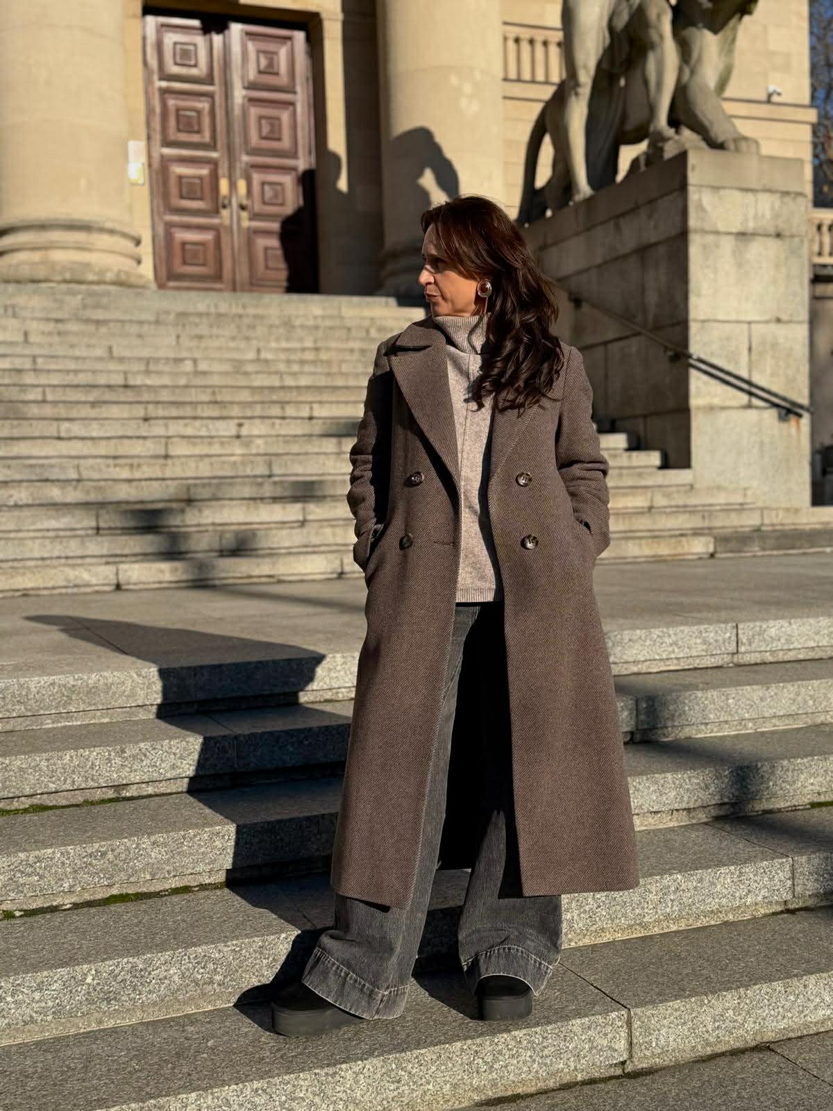 Odkryj nasz płaszcz damski z beżowo-szarego diagonalu z wełny i jedwabiu Lukka i ciesz się ciepłem, nie rezygnując ze stylu, nawet gdy robi się chłodno.
