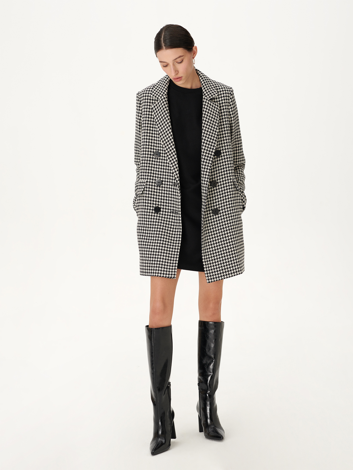 Płaszczyk marynarka w pepitkę to propozycja wiosennego, krótkiego okrycia wierzchniego. Prosty przód, z delikatnie profilowanym tyłem. Fason prosty, przy wyborze większego rozmiaru doskonale wpisujący się w aktualny trend oversizowych marynarek. Długość płaszczyka do połowy uda. Zapięcie dwurzędowe na guziki. Prosta linia ramion, klasycznie wszyte rękawy. Boczne kieszenie wszyte ukośnie, ozdobione patkami. Wykładany kołnierz układający się w wysmuklający dekolt w szpic. Marynarka w całości wykończona na podszewce, bez rozporka na dole z tyłu.