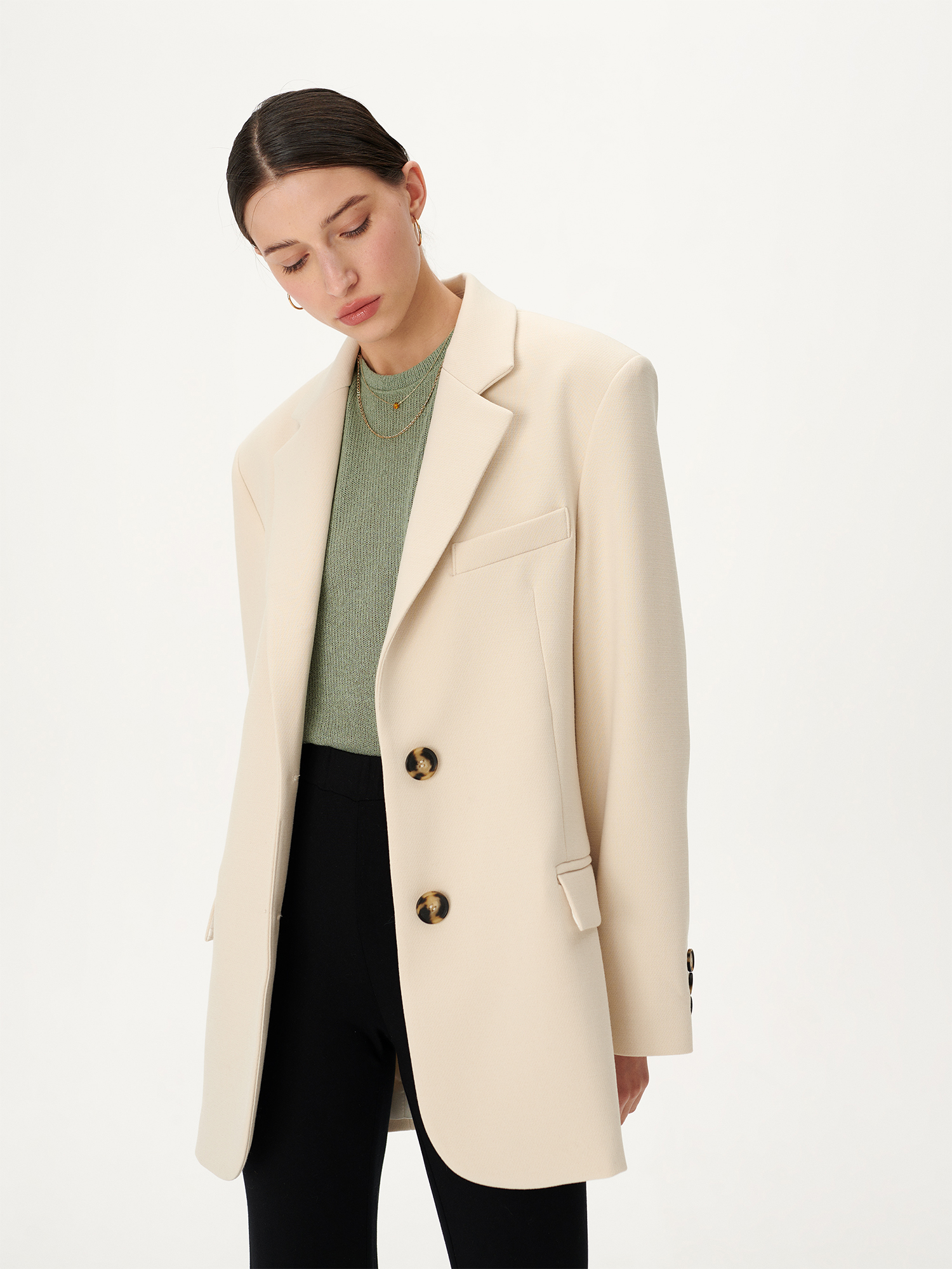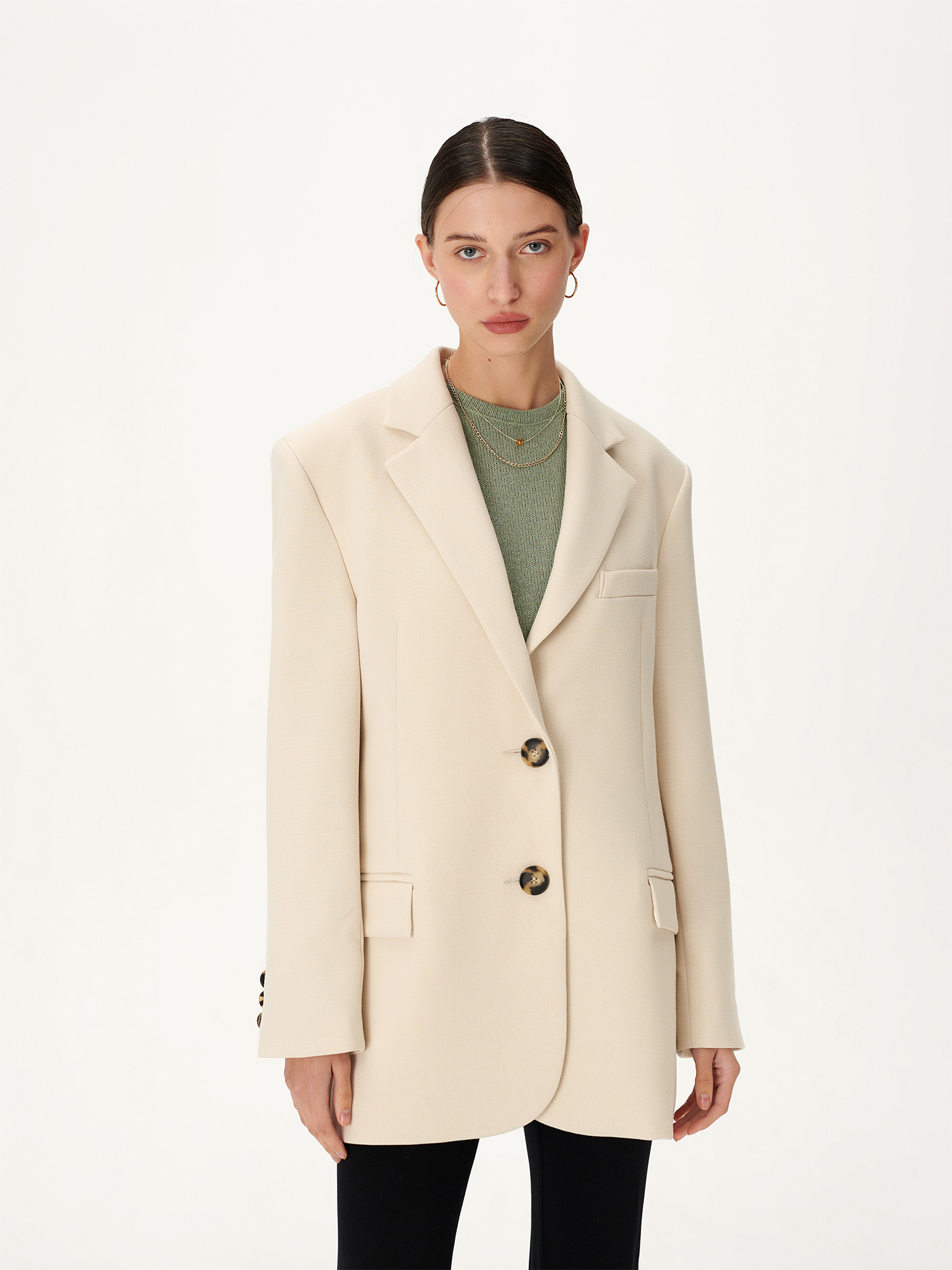 Prosta oversizowa marynarka jednorzędowa Boston. Delikatnie profilowana z tyłu, z przodu z zaszewkami.  Modna linia szerokich, nieco przeskalowanych ramion. Kołnierz rewers modelujący dekolt w szpic. Dwa szylkretowe guziki zapinające, a na rękawach naszyte guziczki w roli ozdoby. Przednie kieszenie wykończone ozdobnymi patkami, na piersi klasyczna marynarkowa kieszonka – brustasza. Bez rozporka z tyłu. Marynarka na podszewce. Świetna zarówno jako tradycyjna marynarka jak i wiosenne okrycie wierzchnie.