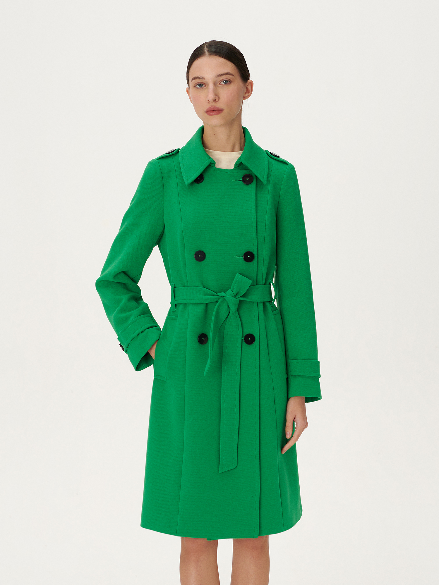 Trencz dopasowany wysoko zapinany Hope to płaszcz typu trencz podkreślający sylwetkę. Klasyczna, prosta linia ramion. Boczne kieszenie ukośnie wpuszczane, zakończone szerokimi listwami. Na ramionach oraz mankietach ozdobne pagony z naszytymi guzikami. Płaszcz z rozcięciem na dole z tyłu (z rozporkiem). Szylkretowe guziki. Płaszcz jest taliowany. Pasek, dodatkowo podkreślający talię, wyjmowany i uszyty z tej samej tkaniny. Model w całości wykończony podszewką, włącznie z rękawami. Wysokie zapięcie dodatkowo zabezpieczy przed wiatrem i zimnem. Idealnie prezentuje się również bez zapiętego ostatniego guzika tworząc wtedy kołnierz typu rewers. Wyśmienity na wiosnę i jesień.